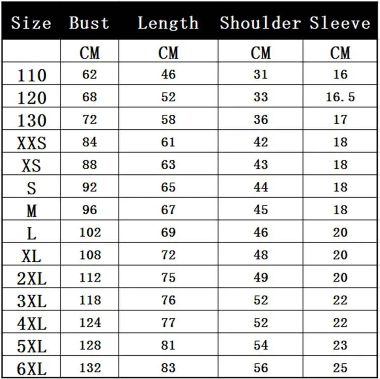 Размер: XXS/XS/S/M/L/XL/XXL/3XL/4XL/5XL/6XL/110/120/130