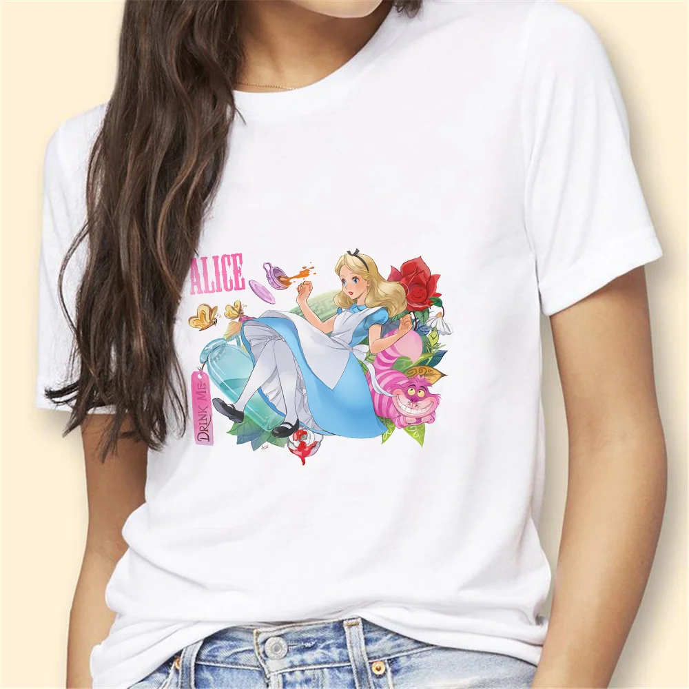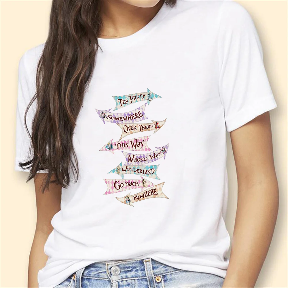 Женские футболки с коротким рукавом, повседневные свободные белые футболки с круглым вырезом и принтом Алиса в стране чудес, милые Мультяшные футболки, футболки с графическим рисунком, 80519