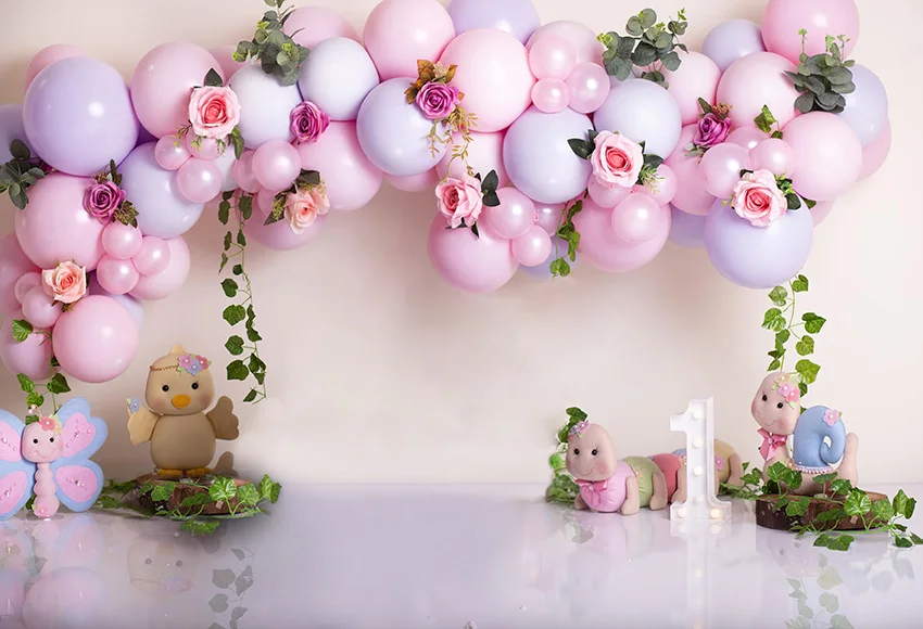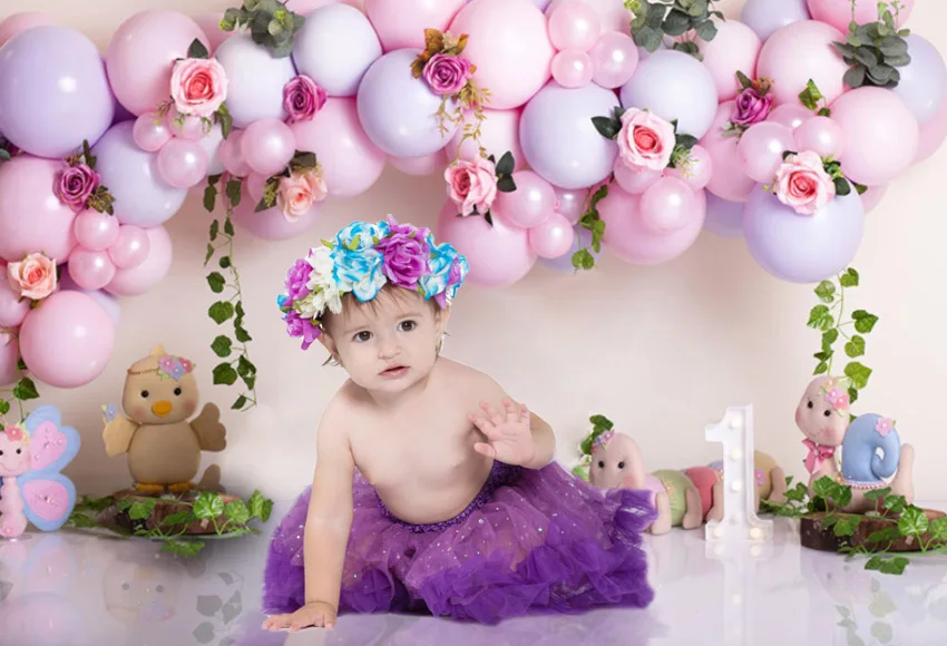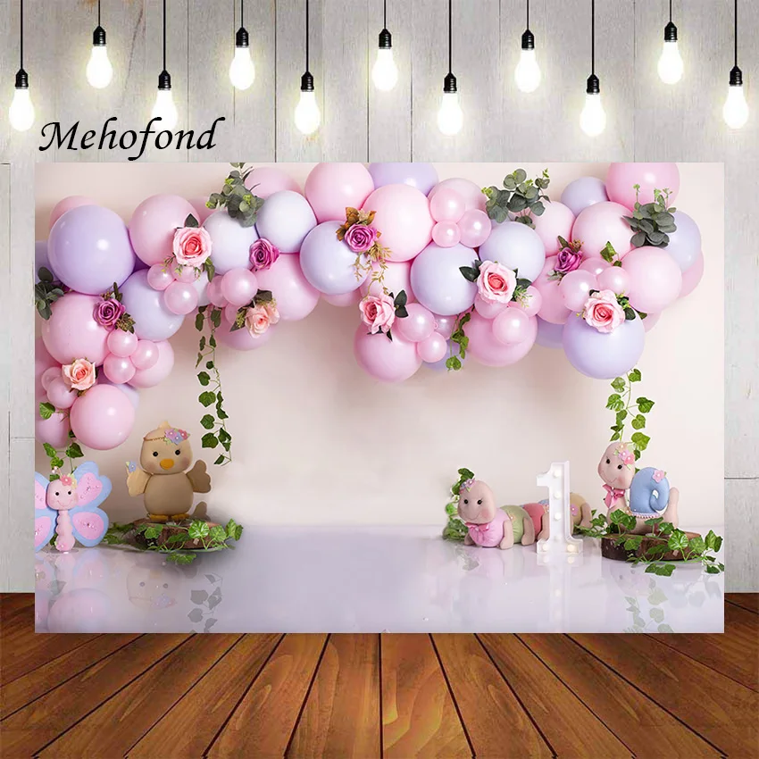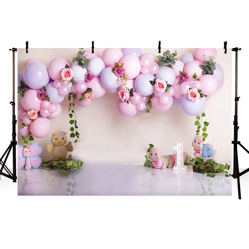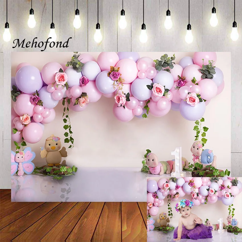 Фон для фотосъемки Mehofond милые животные фиолетовые воздушные шары розовый цветок девушка 1-й день рождения торт разбивать фон фотостудия