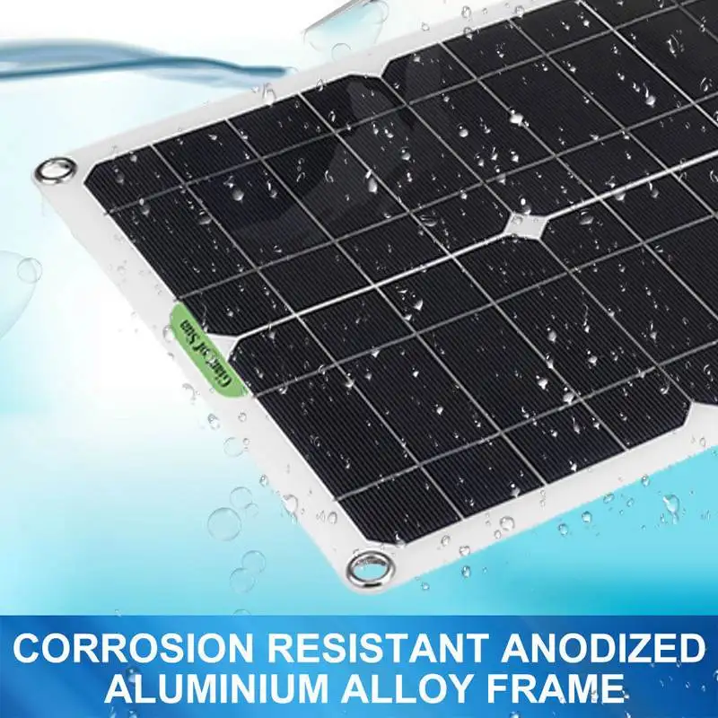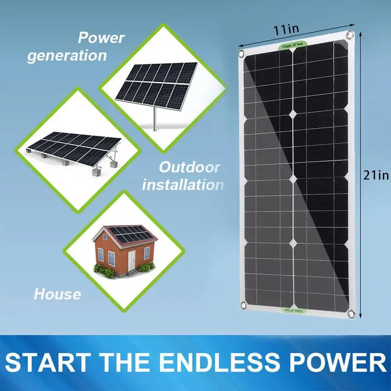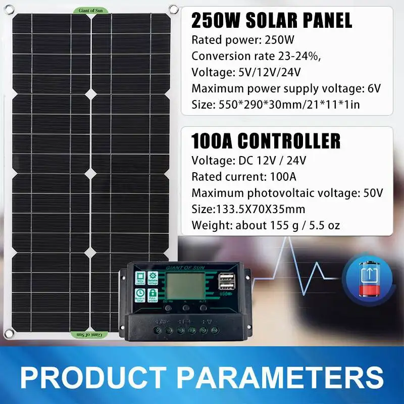 Посылка включает в себя: 1 X Панель солнечных батарей2 X пряжка4 X присоскиАвтомобильное зарядное устройство-1 шт.1 х батарейный зажим1 х Мужской кабель постоянного токаПлата контроллера-1 шт. Спецификация: Название: солнечная панельСтиль: 60A/100AРазмер: 550*290*30 мм/21*11*1 дюймовМаксимальная мощность (pmax): 250 ВтКоэффициент конверсии 23-24%,Напряжение: 5 В/12 В/24 ВМаксимальное напряжение питания: 6 ВТок короткого замыкания: 2АРаспределительная коробка: IP67 RETEDРабочая температура: -40 ℃ + 85 ℃.Цвет: черныйМатериал: монокристаллический силиконовый аккумулятор Характеристика: Используется для зарядки мобильных телефонов, MP3, Pad или других usb-зарядных устройств.Двойной USB женский интерфейс, легко заряжать устройство через usb-кабель для зарядки.Вы можете поставить панель на солнце и использовать ее для прямой зарядки устройства.Очень подходит для езды на велосипеде, альпинизма, пеших прогулок, кемпинга, путешествий и т. д. Примечание: Благодаря светильник и экрана Цвет Товара может быть s светильник ly отличается из-за характеристик монитора компьютера.Возможны незначительные отклонения в размерах из-за различных измерений вручную.