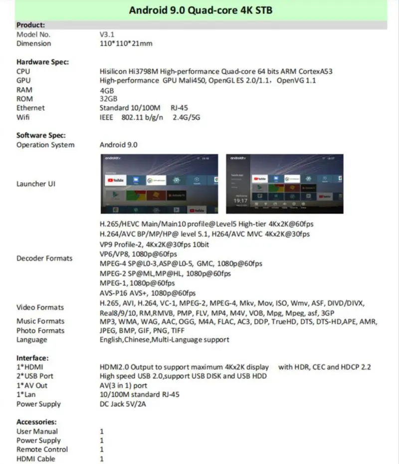 Процессор: Hisilicon Hi3798M Высокопроизводительный четырехъядерный 64 бит ARM CortexA53