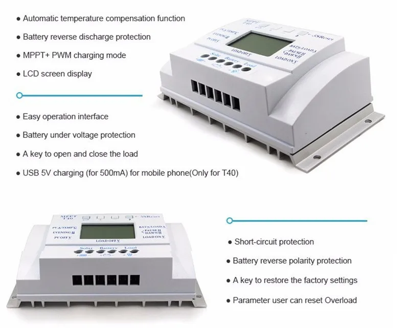 Overviwe:Это совместимый MPPT Контроллер заряда PWM умный/эффективный/энергосберегающий, он не только имеет эффективную функцию зарядки MPPT контроллера для автоматического отслеживания максимальной точки питания, на 10%-30% выше, чем обычная КПД контроллера, также есть энергосберегающие в режиме ожидания, более чем на 30% энергии, чем обычный контроллер, потребляемая мощность в режиме ожидания всего 10 мА-15 мА.