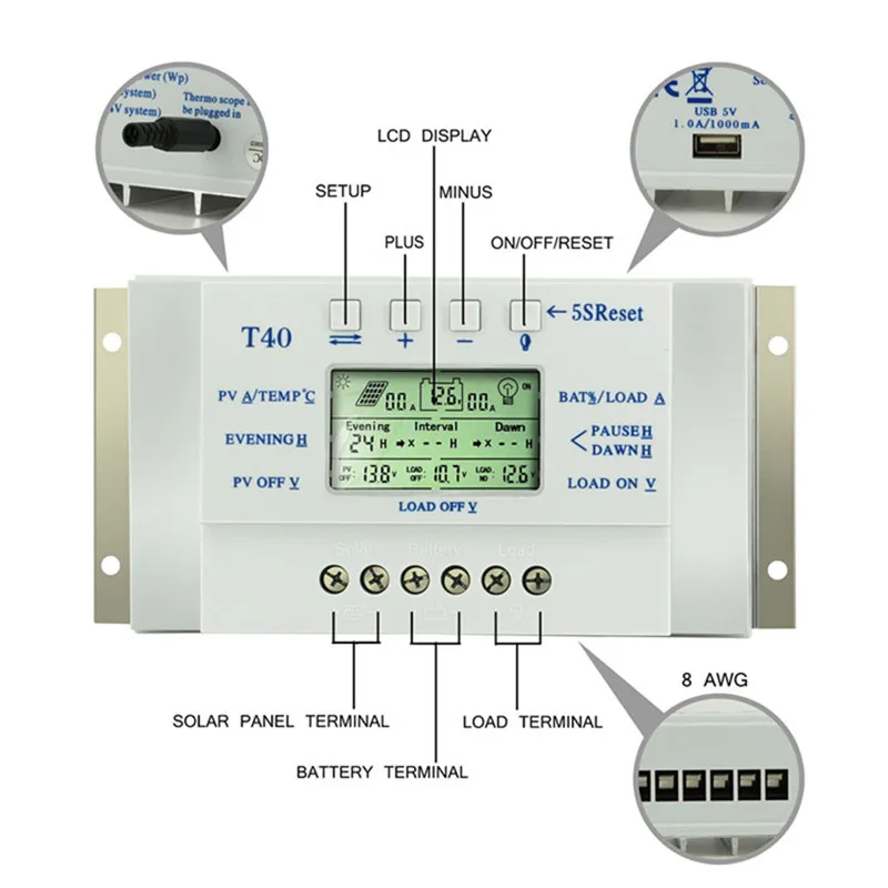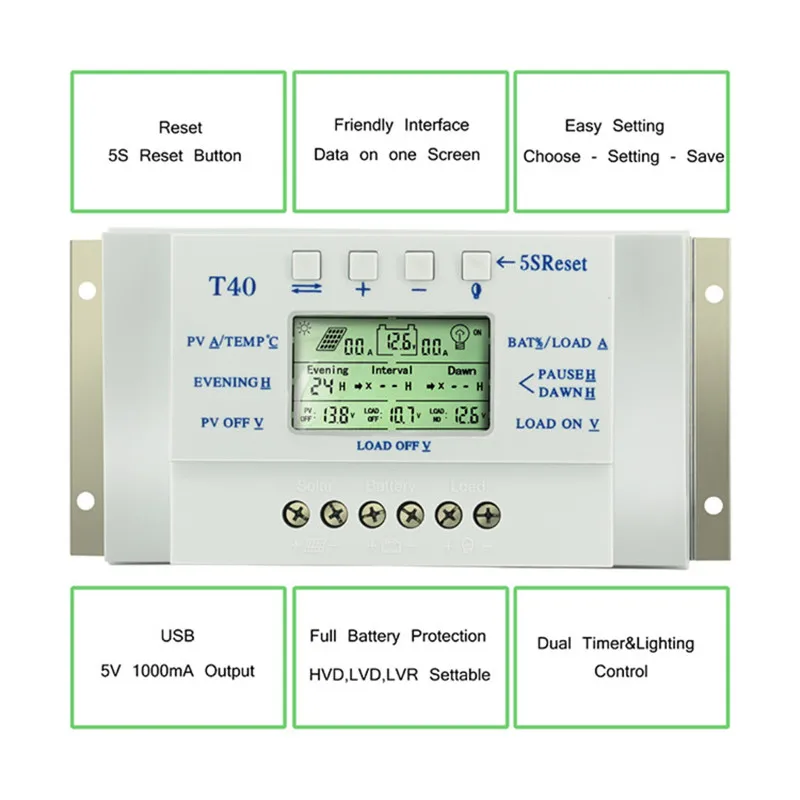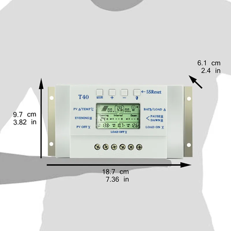 PowMr 40A 12V/24V Авто MPPT регулятором солнечного заряда Управление; Регулируемое двойное Отображение времени Управление ЖК-дисплей Дисплей для дома Панели солнечные PV регулятор T40-S/T40