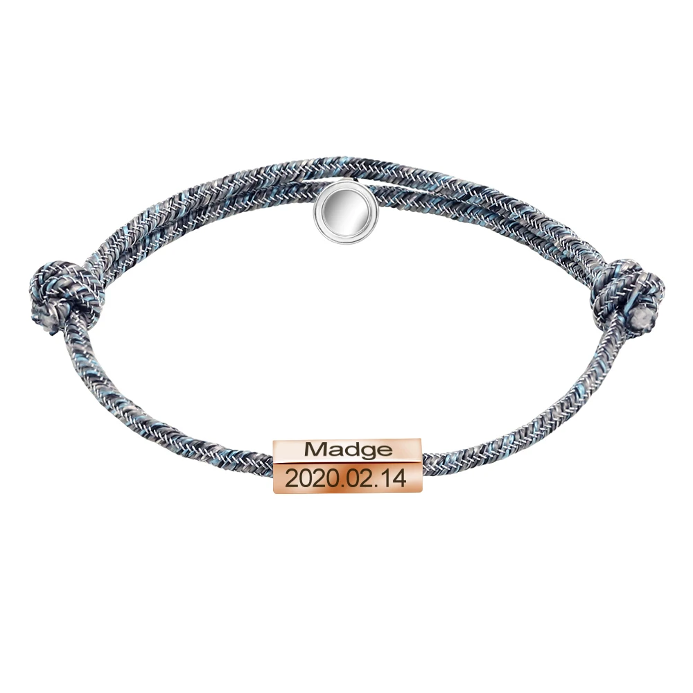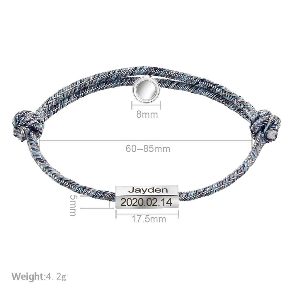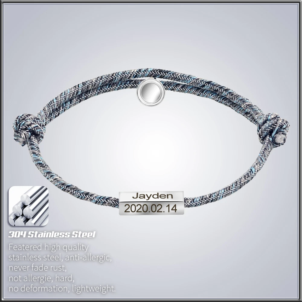 Персонализированные именные браслеты, отличный подарок на день Святого ВалентинаМатериал: нержавеющая сталь + веревкаРазмер бусин: 5x18 ммЦепь: регулируемаяКоличество: 1 пара (2 шт.)Как заказать:* Пожалуйста, укажите имя или дату в поле для заметок *Бесплатная стандартная доставка, 18-25 дней в США и европейские страны.