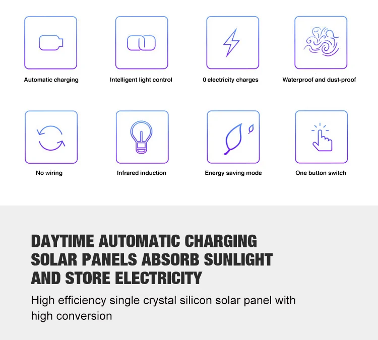 Особенности:1. Легко установить, не вытягивая провода. Необходимо только закрепить изделие на стене с помощью винта.2. Уличная лампа с солнечной батареей, используя энергию солнца для вашего ночного освещения.3. В дневное время светильник не включается, только в ночное время включается переключатель, когда датчик обнаруживает, что тело человека может получить светильник высокой яркости.4. IP65 водонепроницаемая, термостойкая Солнечная лампа, подходит для большинства типов погоды.5. Солнечные наружные огни освещают Ваш сад, двор, проход, крыльцо, двор или подъездную дорожку и т. д.Характеристики:Материал: АБС-пластикРазмеры: 14,8*12,7*2,4 см/5,83*5*0,94 ''(ламповый патрон), 12,8*13,1*1,5 см/5,04*5,16*0,59'' (солнечная панель)Вес нетто: 387 гВес брутто: 468 гПереключатель: без переключателя (штекер)Солнечные панели: поликремний, 5,5 В 1 ВтБатарея: 3,7 V 1200mAh литиевая батарея, перезаряжаемаяМощность Потребляемая мощность: 1,5 WФункция: индукция человеческого телаСветильник источник: 100COB,108COB,120COB,160COBИндукционное расстояние: 5-8 м/16,4-26,2 ФТВремя работы: Зарядка 6 часов в течение дня и работа более 10 часов в ночное времяСпособ установки: подвесная стена с отверстиямиСветовой поток ламп: 180 лмФункция:1. Режим чувствительности ночью, загорается, когда есть люди, загорается, когда нет людей.2. Режим индукции в ночное время, загорается, когда есть люди, небольшие огни, когда нет людей.3. Светильник управления: ночной Светильник ing, не светильник ing в дневное время.Примечания:1. Возможны отклонения в 1-3 см вследствие измерений вручную.2. Из-за различных настроек монитора и светильник эффект, фактический цвет элемента может быть s светильник ly отличается от цвета, представленного на снимках. Спасибо!Упаковка:1 х светодиодный настенный светильник на солнечной батарее1 X Руководство пользователя