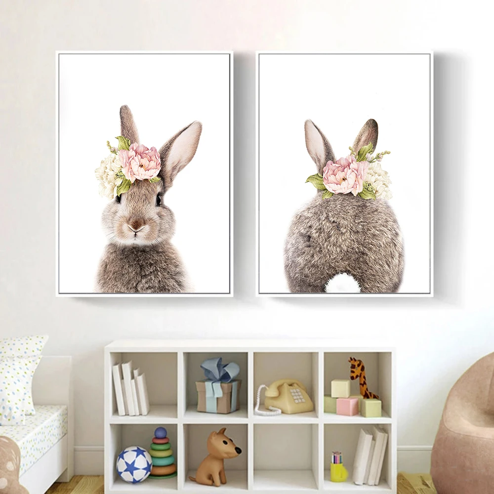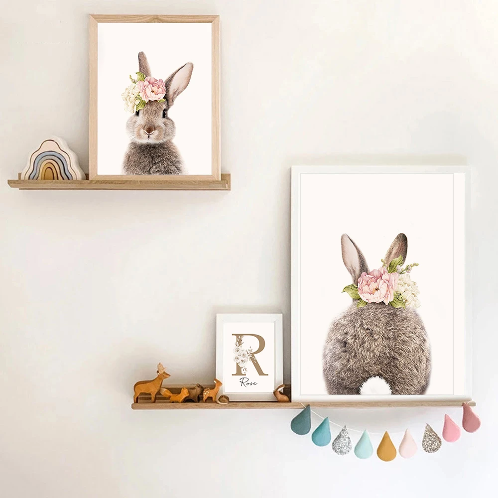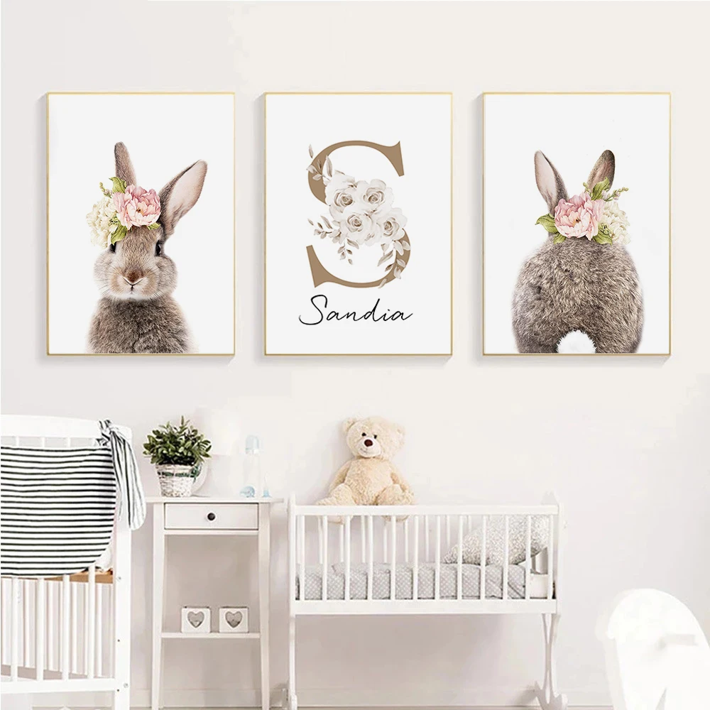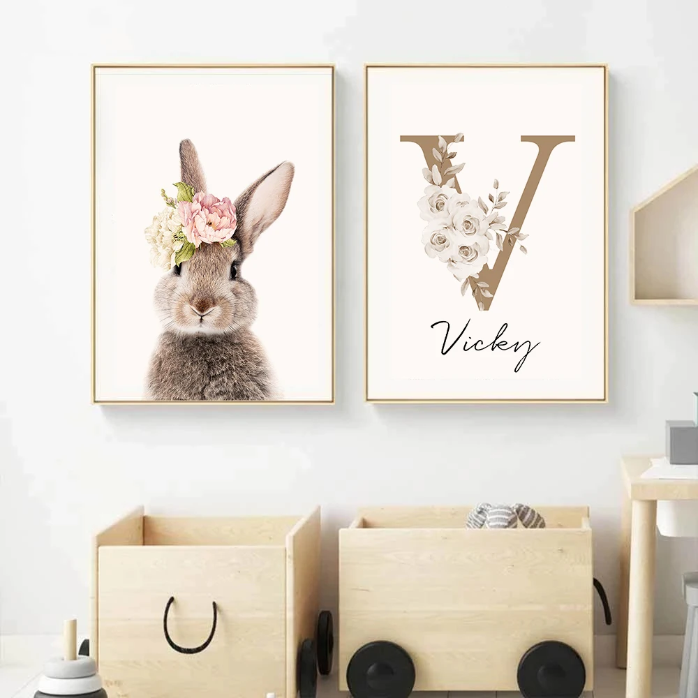 Настенный художественный постер с именем ребенка на заказ, для девочек, спальни, цветочный принт, кролик, фотография