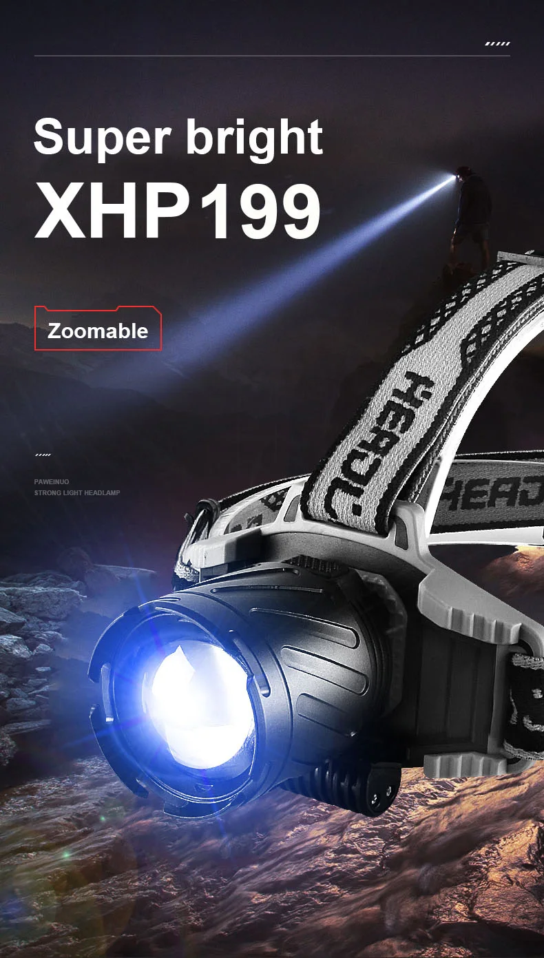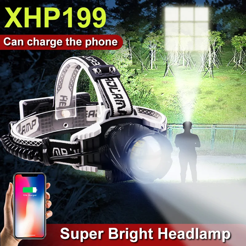 Налобный фонарь XHP199, мощный яркий налобный фонарь, светодиодный головной фонарь высокой мощности с зарядкой от USB, 18650 Водонепроницаемый налобный фонарь для рыбалки