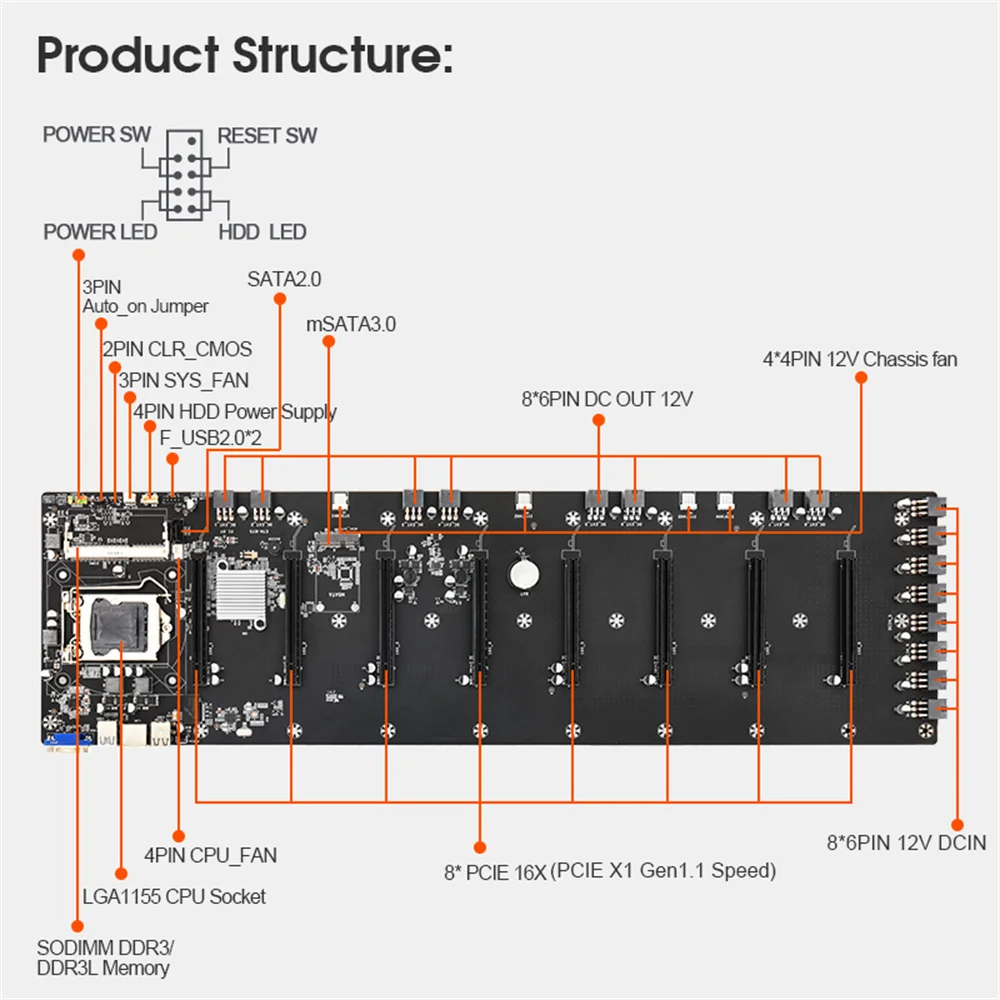 1. Эта материнская плата может использоваться для эфириума ETH / rvcoin (RVN) /shaba2. За исключением RTX3060 серии карт, все остальные обычные горно-видеокарты может использоваться на эту материнскую плату, как, например, RX580 / RX5500 XT / RX5700 / GTX1660 Супер/GTX1660 Ti / RTX 2060 2070 3070 3080 3090 и т. д.3. За исключением карт серии RTX3060, все другие графические карты майнинга могут выпустить обычный hashrate на этой материнской плате.4. Поддерживаются основные операционные системы, такие как windows 10, linux, HiveOS, RaveOS и т. д.5. Расстояние между слотами PCIe ETH-B75 составляет 65 мм (2,56 дюйма), большое расстояние может соответствовать прямой вставке 8 видеокарт большого размера без необходимости передачи переходника.6.ETH-B75 может использовать источник питания ATX и DC. При использовании источника питания ATX необходимо использовать адаптер для короткого замыкания 24-контактной вилки источника питания.Характеристики материнской платы:• 100% новый и высокое качество.• Поддержка процессоров серии Intel Core/Pentium /Celeron LGA1155.• 65 мм (2,56 дюйма) очень большой промежуток между слотами для графических карт, поддержка одновременной вставки 8 видеокарт большого размера.• Рожденный Для майнинга, ключ к богатству.• Высокая совместимость для более высокого опыта.Спецификация материнской платы:> Состояние: полная Новинка> Форм-фактор: 628 мм x 180 мм.> Поддерживаемый Процессор: процессоры серии Intel Core/Pentium /Celeron LGA1155.> GPU слоты: 8 * PCIE x16> Тип памяти: DDR3 SO-DIMM.> Интерфейс хранения: 1 * mSATA 3,0 + 1 * SATA2.0.> Usb-порты: 2 * USB3.0 + 4 * USB2.0.> LAN: Встроенный 1 * Realtek RTL8105E 100M Ethernet.> Интерфейс дисплея: 1 * VGA.> Поддержка системы: windows 10, linux, HiveOS, RaveOS и т. д.Инструкции по покупке:1: цвет нижней пластины слота может отличаться от партии к партии, но это не повлияет на использование продукта. Продукт постоянно оптимизирован и обновлен.2: Пожалуйста, учитывайте разницу в 1-3 мм из-за ручного измерения.3: из-за различных дисплеев и другого светильник, изображение может не показать фактический цвет товара. Спасибо за понимание.4: эта платформа нуждается в мощном источнике питания. Пожалуйста, убедитесь, что ваш источник питания достаточно для поддержки этой платформы.Упаковочный лист