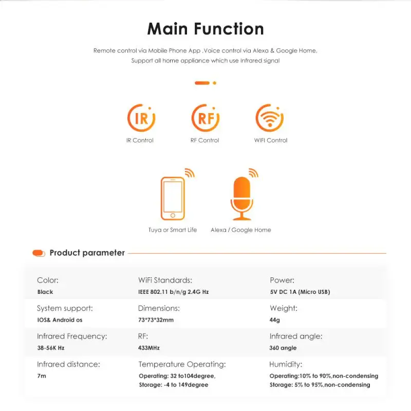 Основные функции: дистанционное управление через мобильный телефон App, голосовое управление через Alexa и Google Home, поддержка всех бытовых приборов, которые используют инфракрасный сигнал