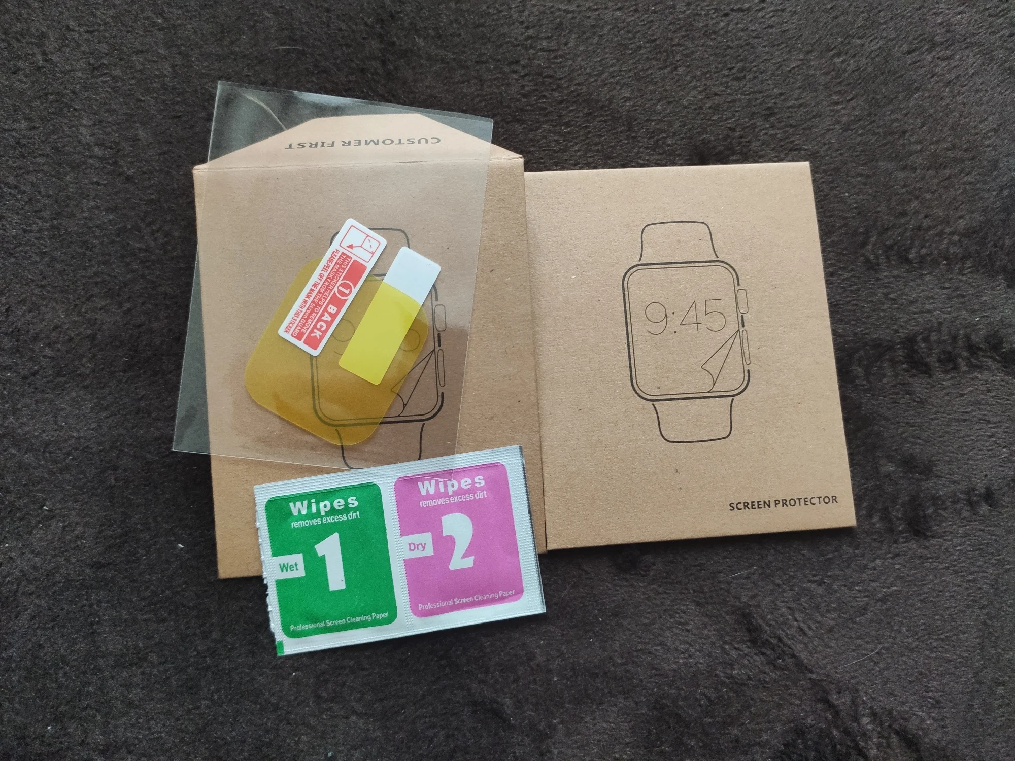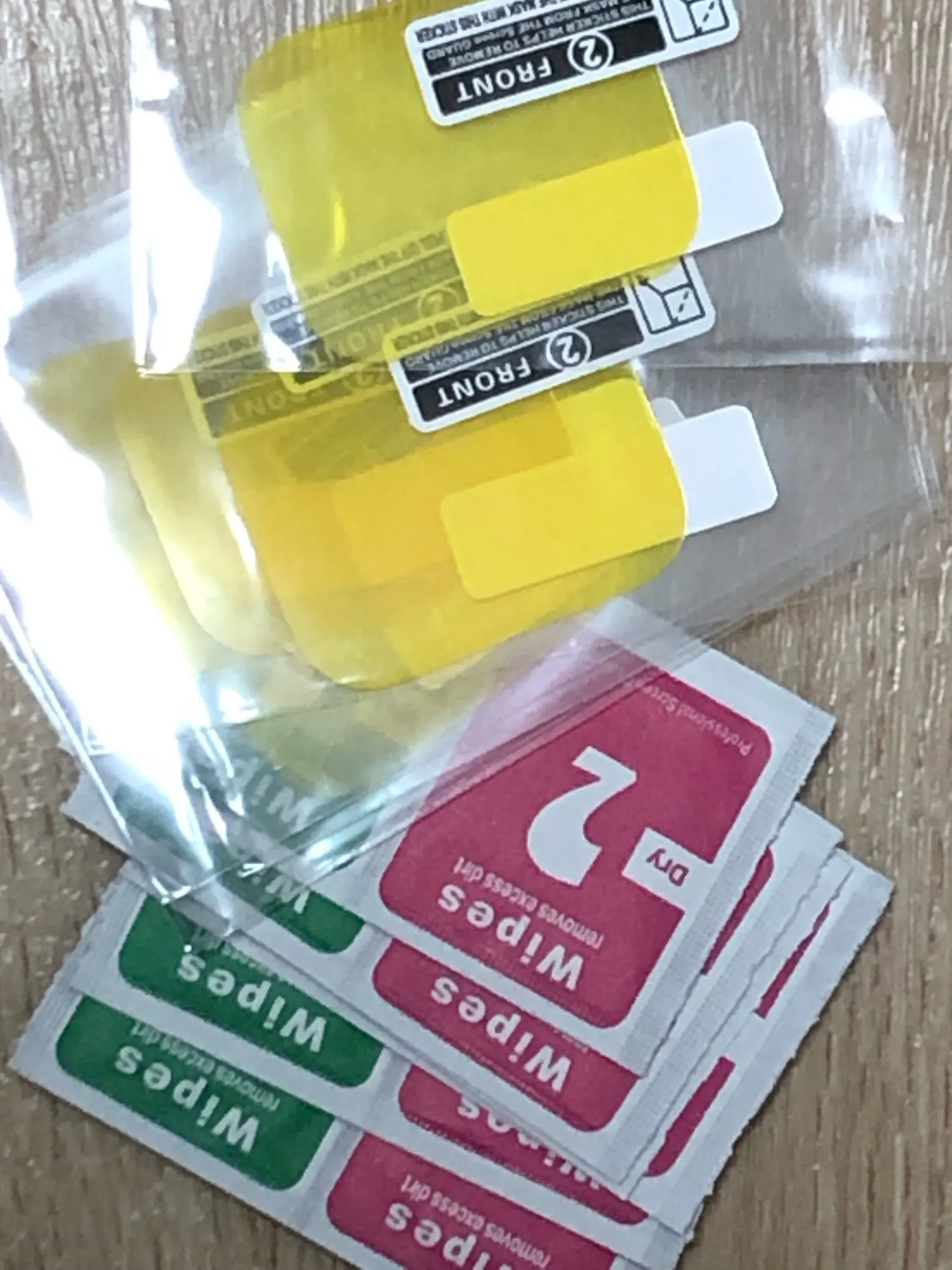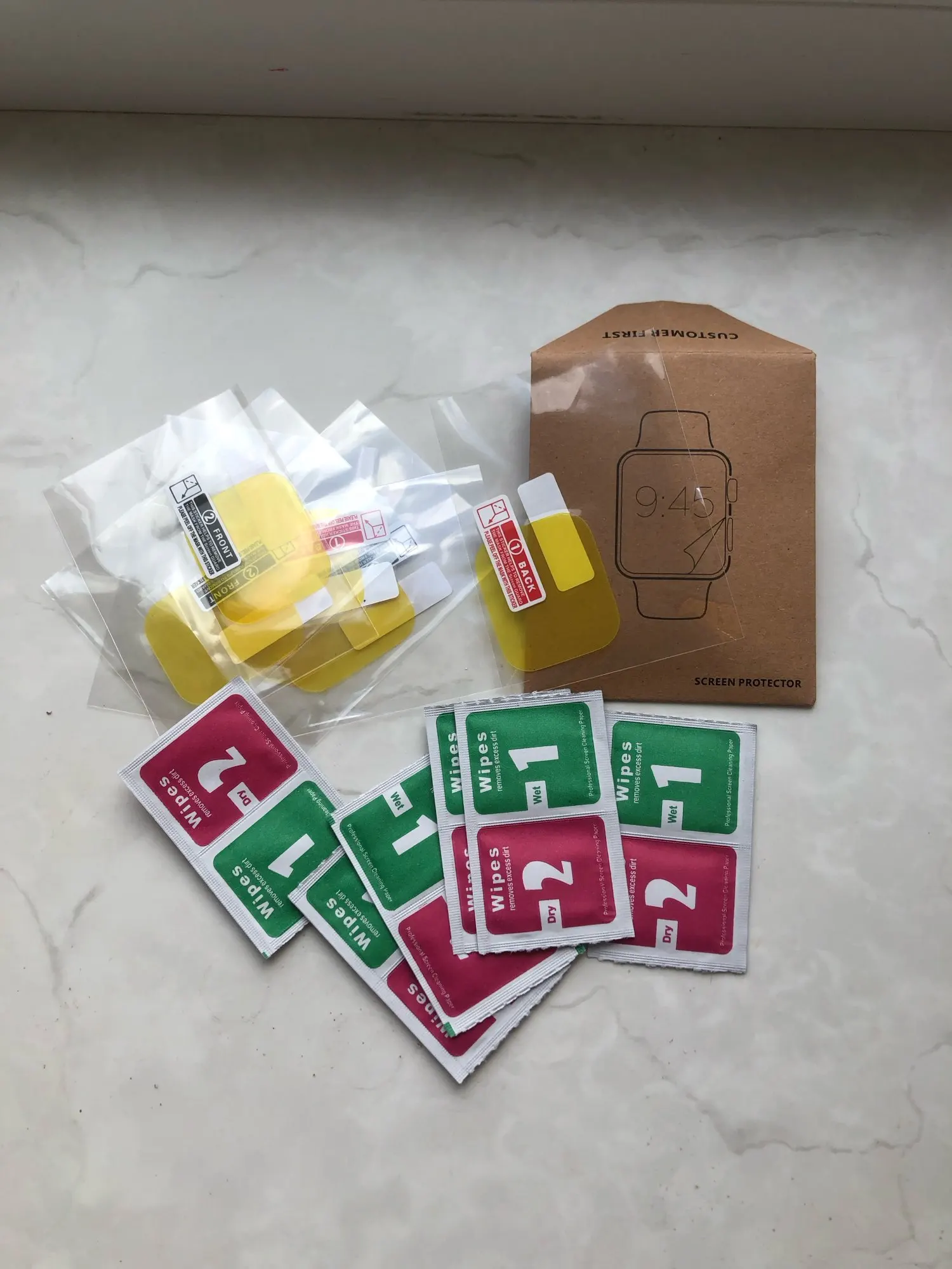 Заказал для своих побитых часиков. После распаковки подумал что не тот размер. После осмотра оказалось что размер именно под экран без закругления. эх надо искать чтоб точно ложилось на экран. Содержание конверта: салфетки и пленки.