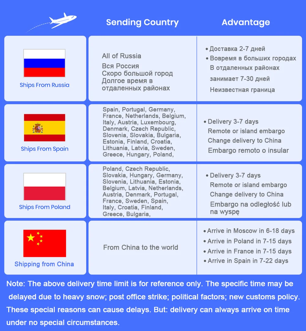 Отдаленные или островные районы,Пожалуйста, выберите доставку из Китая вместо испанского склада. Спасибо!Для испанского склада, для цифр, начиная с почтового кода 08/30/35/38/07/51/52,Испанские склады не принимают поставки, потому что они являются удаленными адресамиИли остров. Для адреса острова в Португалии/Франции/Италии/Великобритании и т. Д., только склад в Китае поддерживает доставку, а склад в Европе не поддерживает адреса острова.