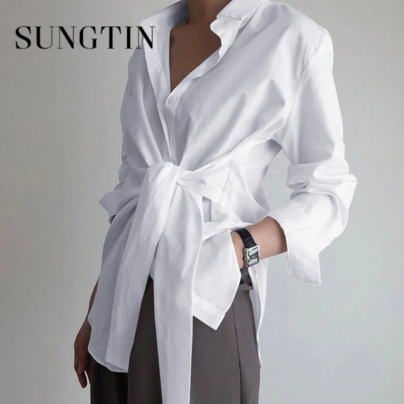 Sungtin 2022 новая весенне-осенняя женская рубашка Корейская бандажная Повседневная Блузка оверсайз рубашки Женская мода офисный женский элегантный топ