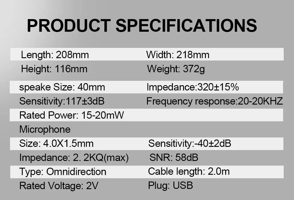 -Тип наушника: схематический (охватывает и полностью окружает ухо). Мягкое прикосновение и пассивная acustic изоляция.-Материал повязки: металлик, гибкий. Интегрирован в структуру.-Вибрация: нет.-Частота отклика: 20 - 20k Гц.-Сопротивление: 32 Ом.-Диаметр диафрагмы: 40 мм с неодимовыми магнитами.-Чувствительность: 117 дБ.-Подсветка: Кольцо RGB.-Тип кабеля: 2 м, высокопрочная резина.-Разъемы: USB 2,0.-Вес: 360 г.-Программное обеспечение: микрофон-Сопротивление: 2,2 k Ом-Чувствительность: -40 дБ +/- 3 дБ-Тип микрофона и направленность: гибкий, интегрированный в ушную чашку. Всенаправленный.-Дополнительные сведения: универсальная подставка для гарнитуры.