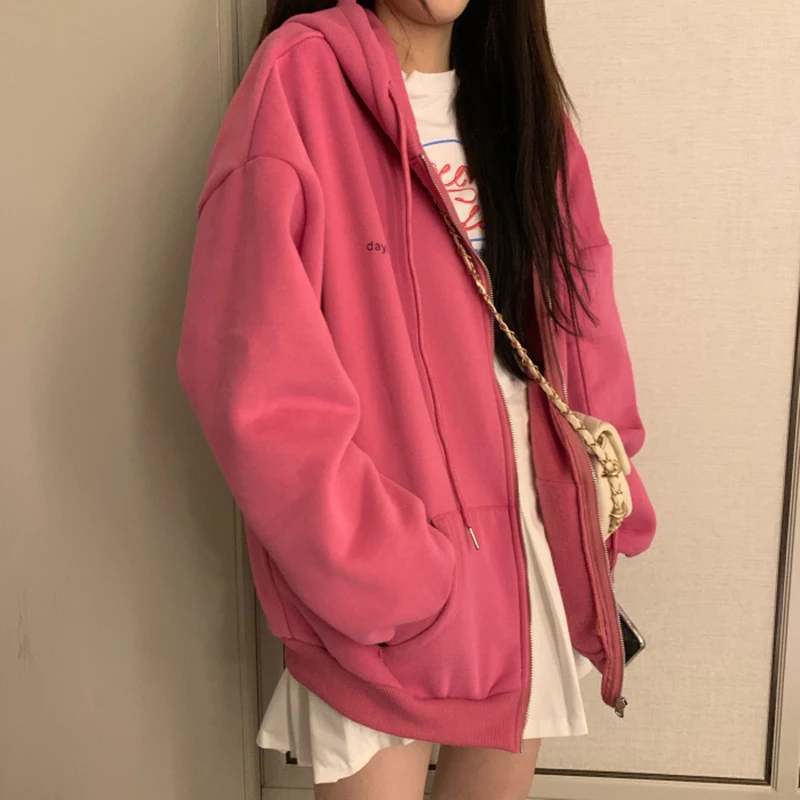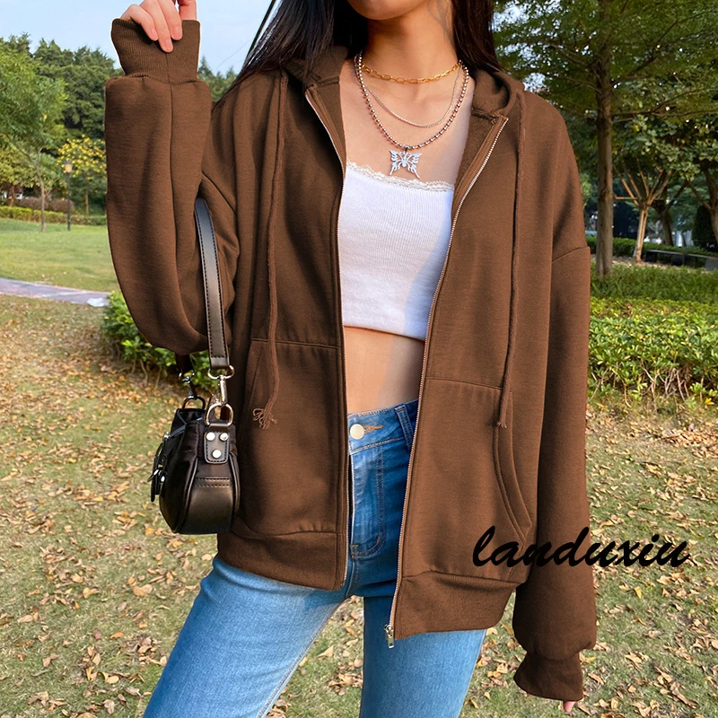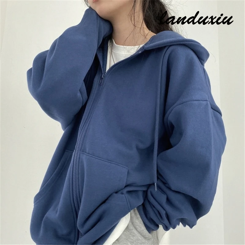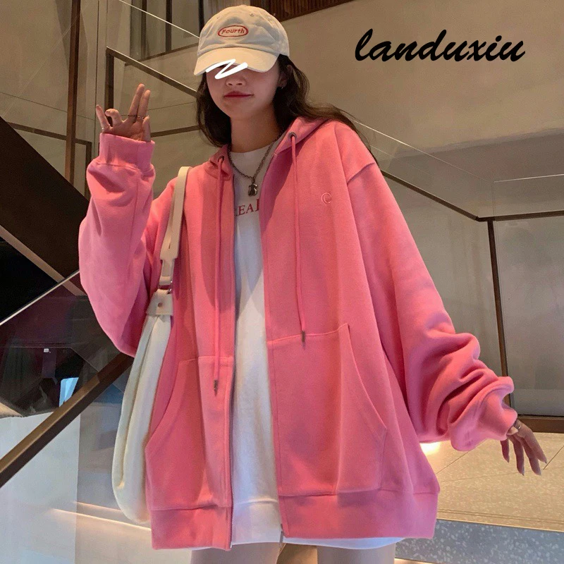 Толстовка Landuxiu в Корейском стиле, на молнии, в стиле Харадзюку, большие размеры, однотонные свитшоты с капюшоном и карманами, осенняя свободная бейсбольная куртка с длинным рукавом