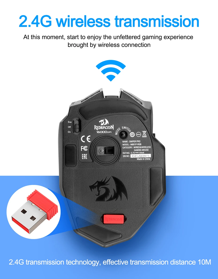 Беспроводная игровая мышь Redragon Sniper Pro M801P, RGB, USB, 2,4 ГГц, 16400DPI, 10 кнопок, программируемая эргономичная геймерская мышь для ноутбука и ПК