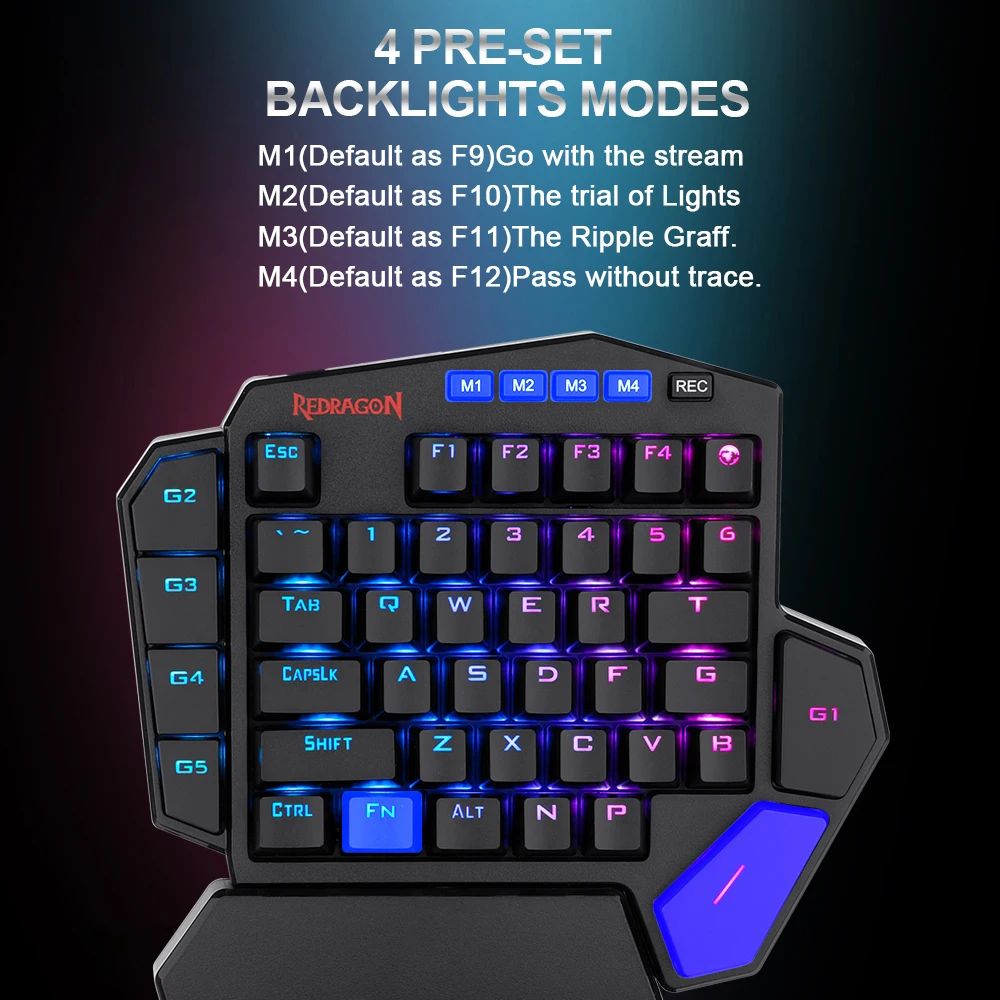 FN + ESC: Нажмите и удерживайте в течение 3 секунд, вернитесь к заводской установке4 режима предварительной установки подсветки: M1 (по умолчанию как F9) перейдите к потокуM2 (по умолчанию как F10) пробный светM3 (по умолчанию как F11) пульсация Graff.M4 (по умолчанию как F12) проходит без следа.