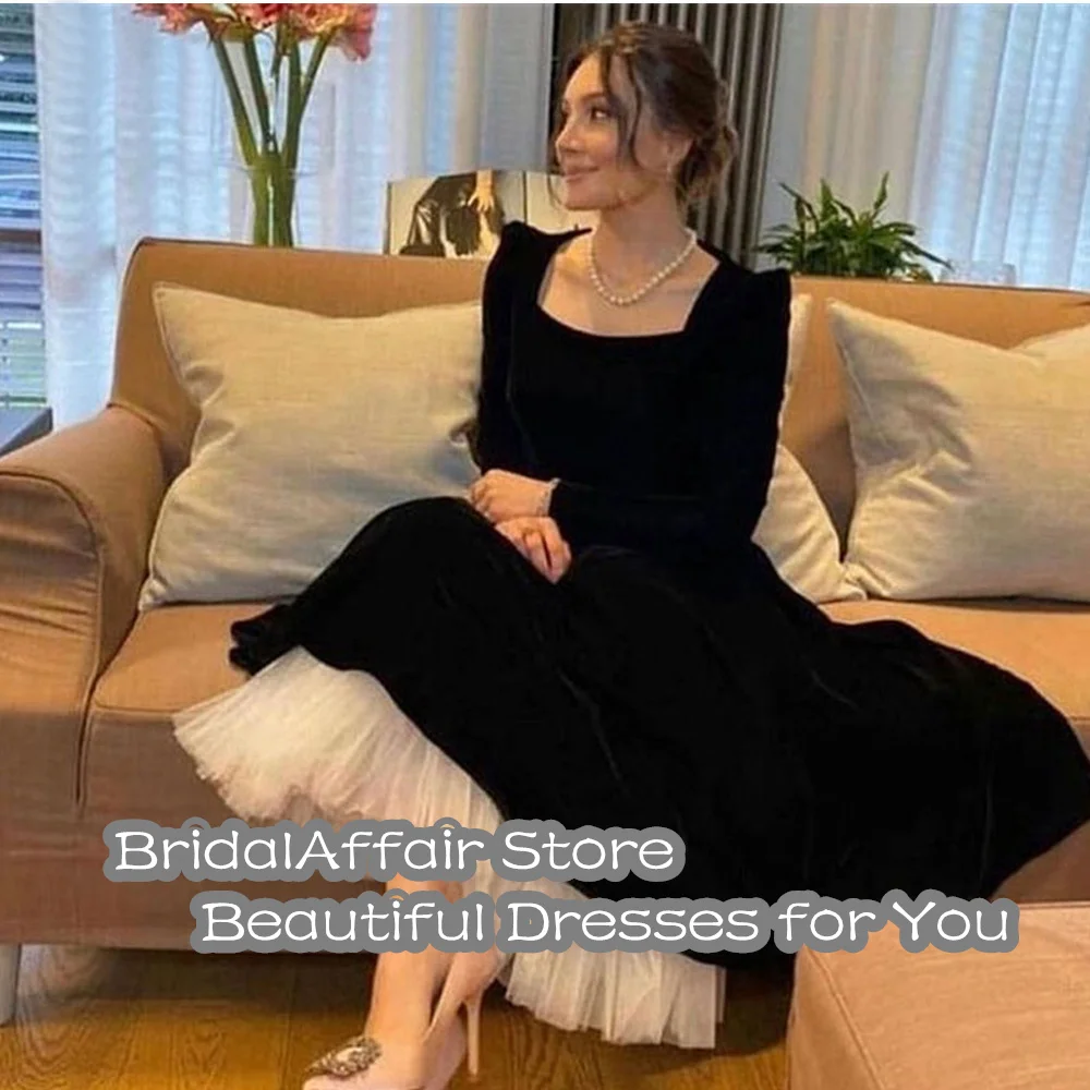 BridalAffair, скромные черные вельветовые вечерние платья с длинным рукавом, квадратным вырезом, длиной ниже середины икры, простые официальные платья для выпускного вечера
