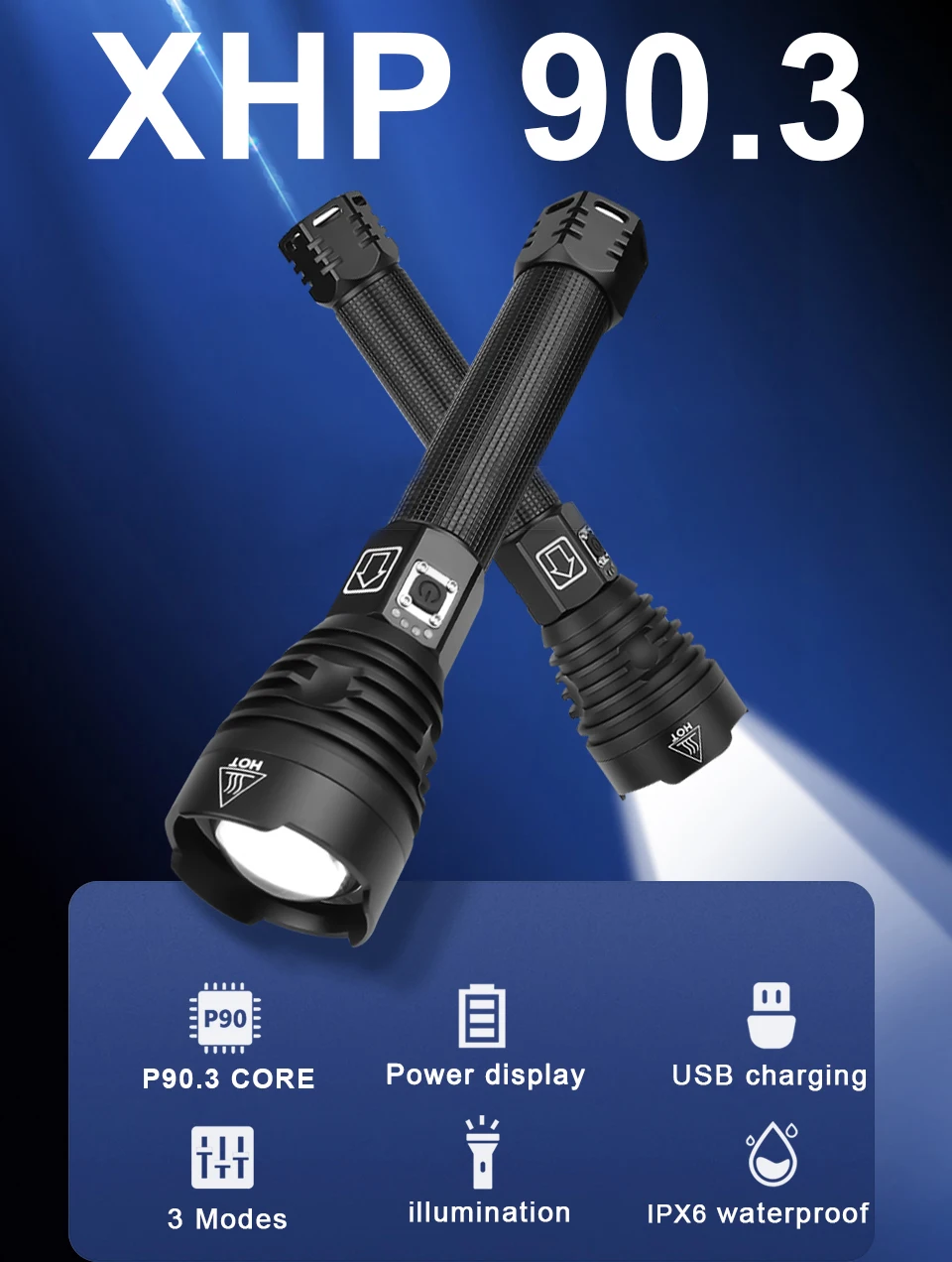 Самый мощный светодиодный фонарик 1909 XHP90, 18650 или 26650 свето...