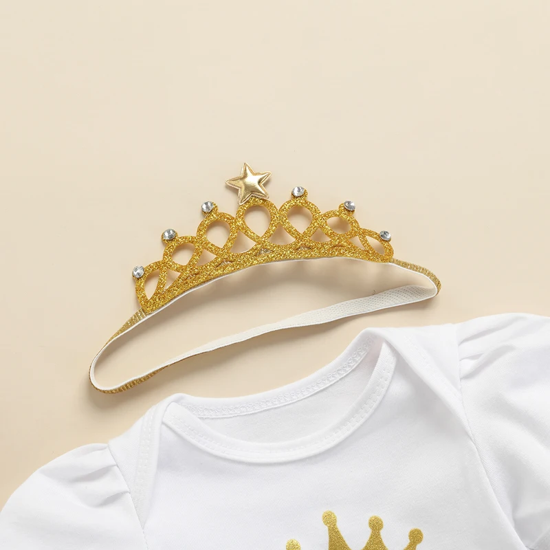 Комплекты одежды для маленьких девочек на день рождения; Белый сетчатый комбинезон с короткими рукавами и буквенным принтом + повязка на голову с короной + золотистая обувь