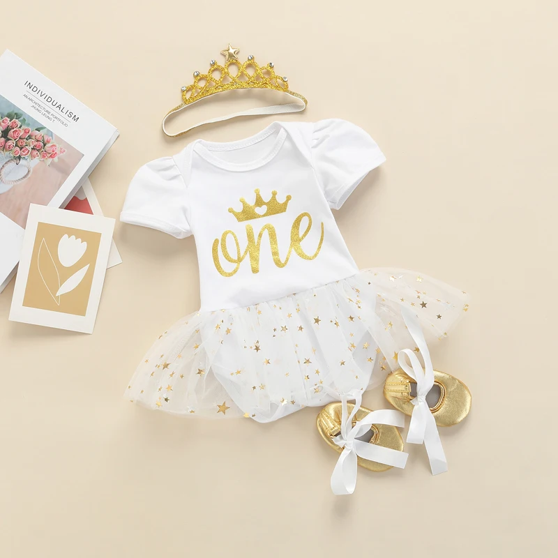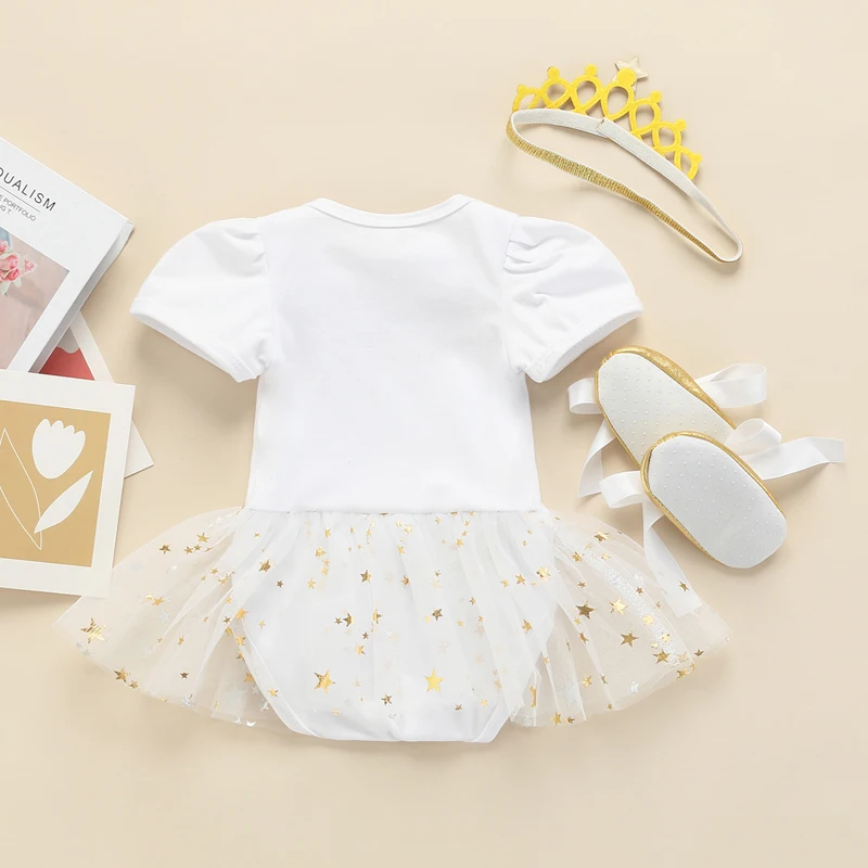 Комплект одежды FOCUSNORM для маленьких девочек 0-18 месяцев, сетчатый комбинезон с надписью, платье + повязка на голову с короной + Золотая обувь для дня рождения