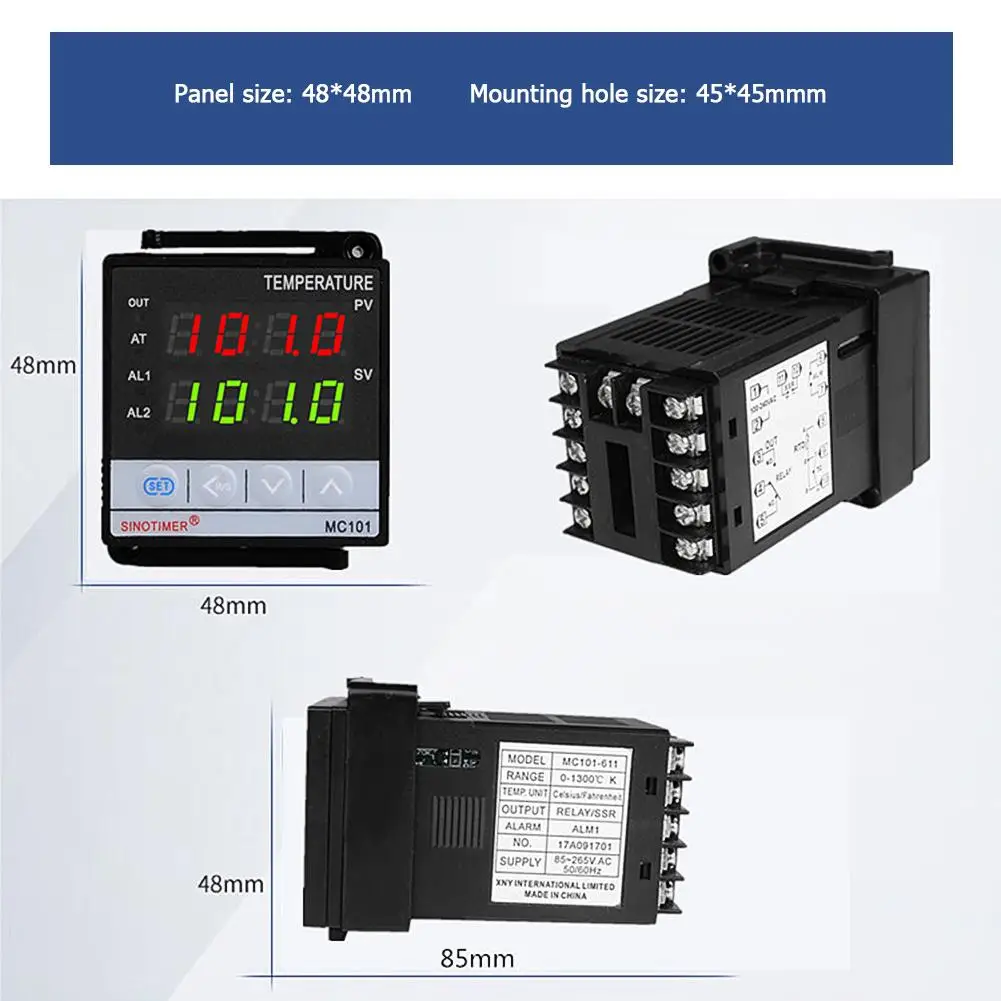 Особенности: Точность контроля температуры, высокоточный чип, несколько дисплеев, интегрированный выход, простая установка, четкая идентификация. Универсальный вход, пользователь может автоматически изменить требуемый входной сигнал. Сигналы термопары (K, E, J, N, S, T, R, B и т. д.). Сигнал теплового сопротивления (Pt100). Пользователи могут переключаться на °F или °C. 1 Набор контрольного выхода (реле и SSR интегрированы), пользователи могут свободно использовать релейный выход или SSR выход. Когда сигнал термопары вводится, цифровой дисплей может принимать десятичную точку. Минимальное разрешение 0,1 °C/0,1 °F. Короткие оболочки с глубиной 85 мм/3,35" Характеристики: Размер: MC101: 48*48 мм/1,89*1,89" MC701: 72*72 мм/2,83*2,83" Материал: пластик + монтажная плата Рабочая мощность: 85-265 В переменного тока, 50/60 Гц Потребляемая мощность продукта: менее 10 ВА Режим ввода: Универсальный вход (K, E, J, PT100) Диапазон температур: -199 ~ 1300 (℃) Точность измерения: ± 0.5% FS Режим управления: самонастройка PID контроль. Примечания: 1. Из-за различных настроек монитора и светильник эффект, фактический цвет элемента может быть s светильник ly отличается от цвета, представленного на снимках. Спасибо! 2. Возможны незначительные отклонения в измерениях из-за ручного измерения.
