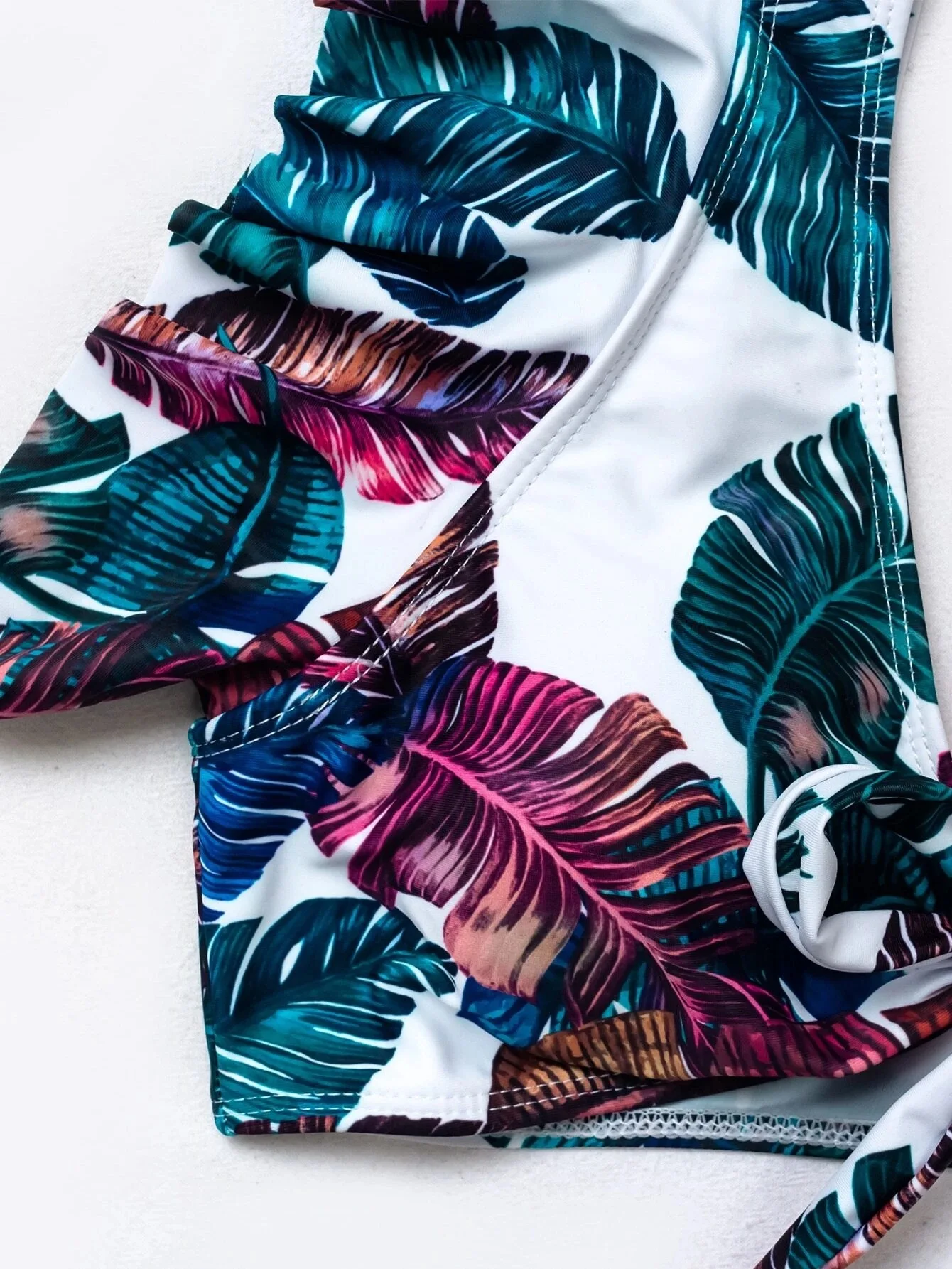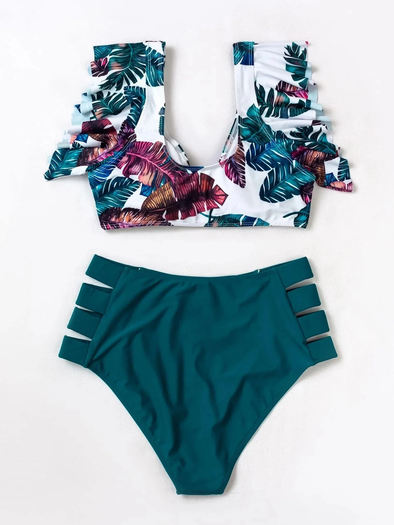 Женский купальный костюм с высокой талией, цветочным принтом и оборками