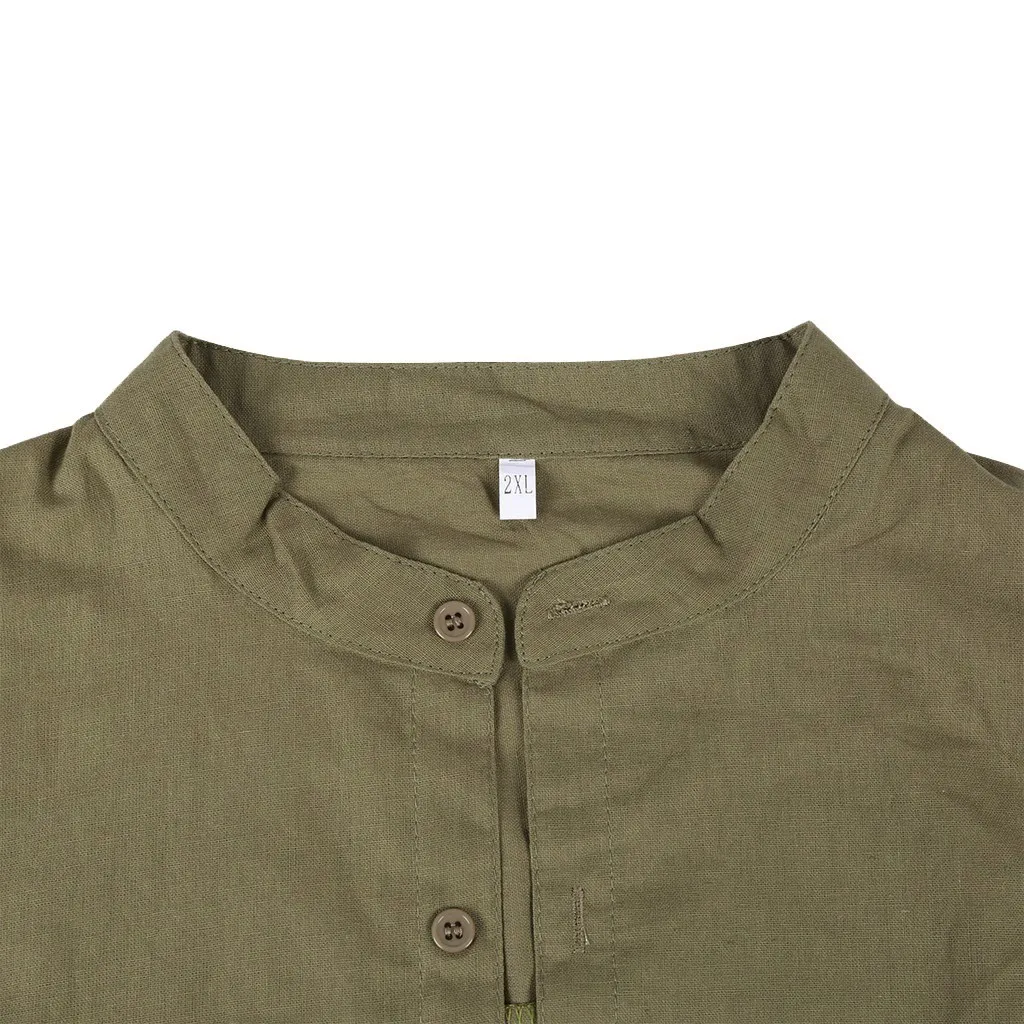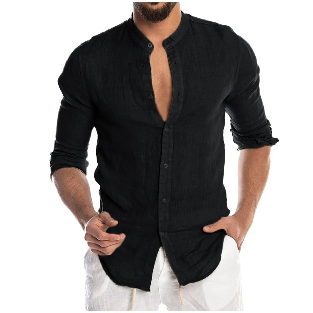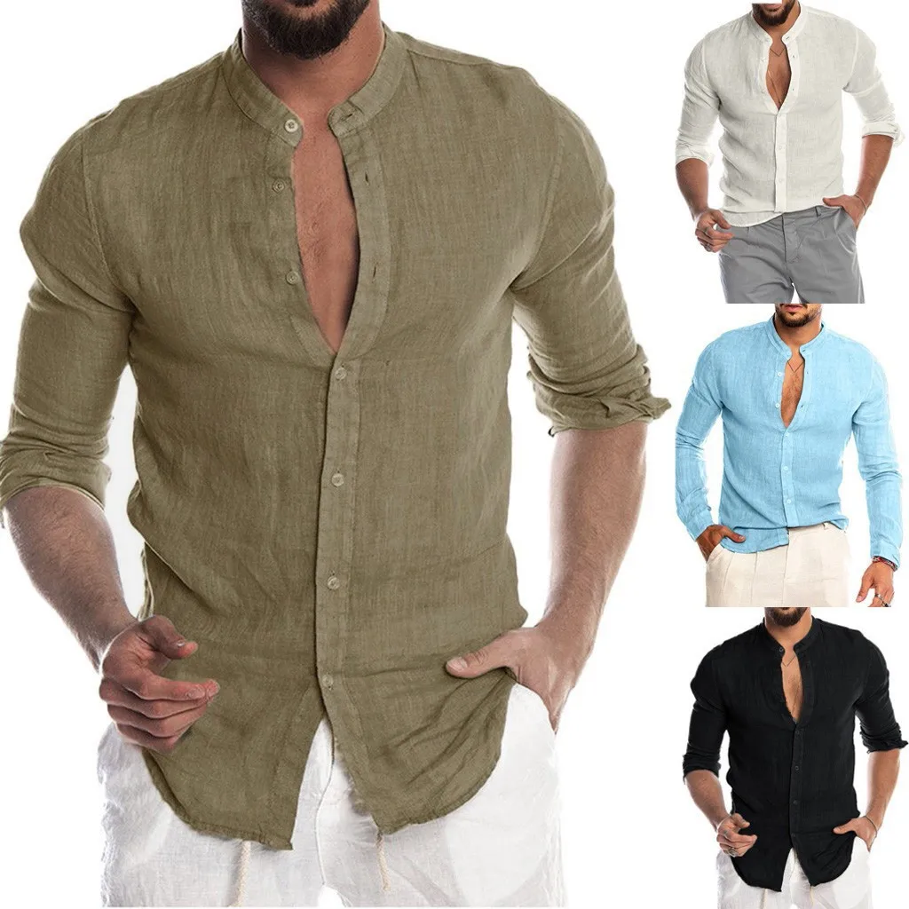 Рубашка мужская с круглым вырезом, модная повседневная однотонная пляжная блузка на пуговицах, Топ с длинным рукавом, 2022