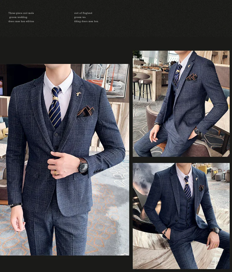 3 шт., мужской Клетчатый деловой костюм, Блейзер, жилет и брюки