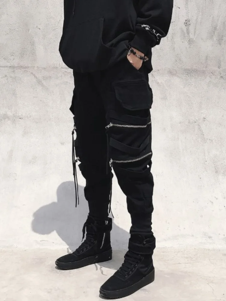 Брюки-карго мужские черные в стиле Харадзюку, Джоггеры в стиле панк, эмо, уличная одежда в Корейском стиле, на молнии, с лентой, на осень
