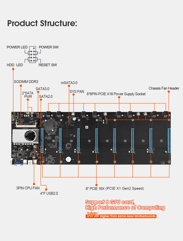 Особенности:1. Слот для памяти, 8 разъемов для видеокарты.2. Высокая производительность вычислений, на 10% выше, чем Материнские платы того же уровня.3. Оснащен Sodimm DDR3 слотом памяти, 16*6pin PCI-E X16 разъем питания, значительно повышает производительность материнской платы.4. Конденсатор стабилизации напряжения может обеспечить стабильное напряжение для вашего оборудования электропитания.5. Он может обеспечить тихую производительность, низкое энергопотребление, меньшее количество тепла, энергосбережение и безопасное использование.Модель: BTC-D37Память: 1 * DDR3 Sodimm слот, поддержка 1066/1333/1600 МГцХранение: 1 * SATA3.0 + 1 * SATA2.0 + 1 * m SATA2.0USB: 4 * USB2.0Сетевой порт: гигабитный сетевой порт RJ45Расширяемый порт: 8 * PCIE 16X,16*6pin PCIE X16 разъем питания, HDMI-совместимый + VGAMSATA SSD:Емкость: 128 ГБРазмер: 50х30х3 ммТребования: DC3.3V / 1AПрименение: рабочий стол, ноутбук, сервер, точность добычиСостояние: абсолютно новый, различные брендыRAM:Чип: SEC / HY / MT или другое (отправлено случайным образом)Тип: без ECC, без REG (память ноутбука)Частота: DDR3 1600 МГц или DDR3L (отправлено случайным образом)Емкость: 4 ГБ DDR3 1600 МГцКабель питания:Калибр провода: 18 AWGДлина кабеля: 10,23 дюйма/250 мм8-pin женский конец используется для подключения к разъему питания источника питания.Два 8-pin (6 + 2) Мужской заканчивается подключаются к видеокарта и добыча материнская плата.Дружеское напоминание:Проверьте, полностью ли кабель совместим с вашим устройством. Если вы не уверены, пожалуйста, немедленно свяжитесь с нами перед оформлением заказа.Количество: 10 шт.Упаковочный лист:1 * материнская плата1*128 ГБ mSATA SSD1*4 ГБ/8 ГБ DDR3 RAM10*8pin кабель питания