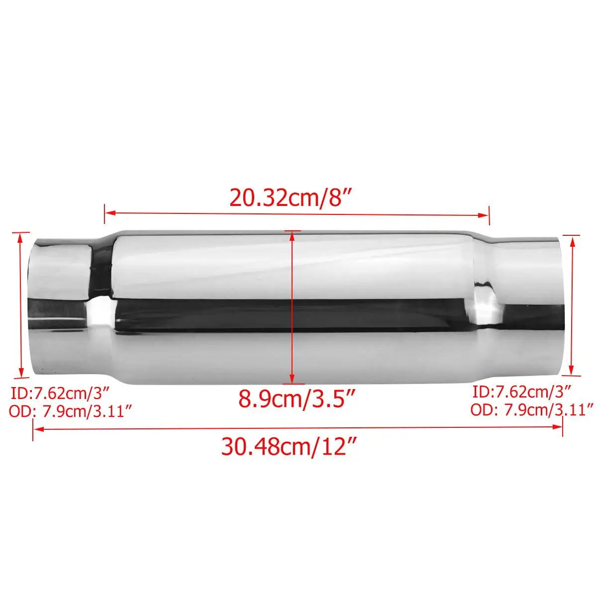 Спецификация:Название продукта: автомобильный глушительМатериал: нержавеющая сталь 304Цвет: хромОбщая длина: 30,48 см/12"Внутренний диаметр входа и выхода: 7,62 см/3"На входе и выходе внешний Диаметр: 7,9 см/3,11"Коробка Диаметр: 8,9 см/3,5"Длина коробки: длина: 20,32 см/8"Отделка поверхности: полированная