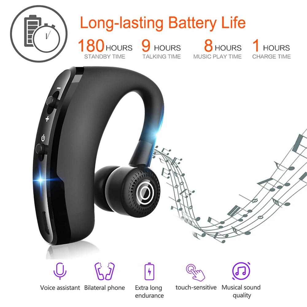 Характеристики: 1. Беспроводные наушники V9 Встроенный аккумулятор емкостью 140 мАч обеспечивает защиту аккумулятора в любое время и в любом месте. 2. Интеллектуальное активное шумоподавление, уменьшает Окружающий шум и делает вызов более четким. 3. Каждый раз, когда bluetooth-гарнитура подключается к телефону, bluetooth-гарнитура автоматически подключается к телефону при включении, что удобно и быстрее. 4. Интеллектуальная Совместимость: Поддержка всех мобильных телефонов с функцией Bluetooth, планшетное устройство для ноутбука, всех мобильных телефонов 5. Вы можете одновременно подключить два совместимых с Bluetooth устройства, переключиться на прослушивание песен, игр и звонков в любое время. 6. Водонепроницаемые, влагозащищенные и пыленепроницаемые резиновые пробки для предотвращения пота, воды и пыли от коррозии компонентов 7,270 градусов вращающийся дизайн, подходит для левого и правого уха 8. Высокое качество прослушивания звонков долгий срок службы батареи не боится выхода из строя 9. V9 Автомобильная гарнитура для бизнеса с микрофоном