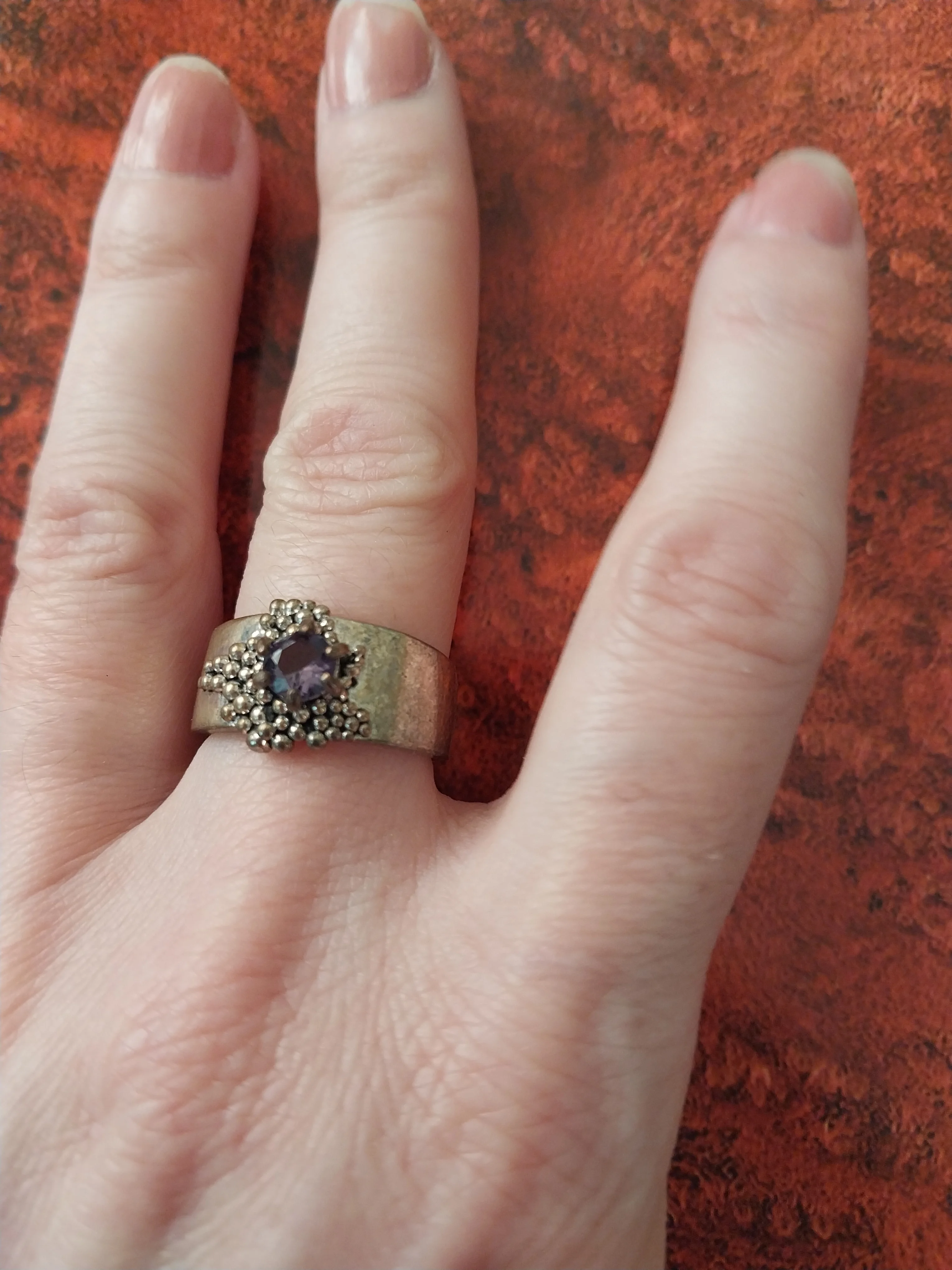 Кольцо женское серебристое с фиолетовым кристаллом и фианитом, стразы