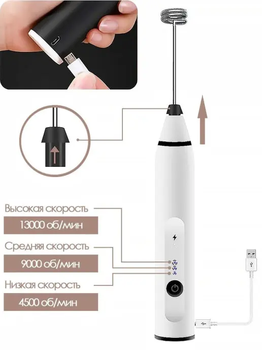 Беспроводной капучинатор быстро превратит молоко или сливки в воздушную пену за несколько секунд. Пены в 2 раза больше по сравнению с аналогами. В отличие от других производителей с батарейками, этот мини миксер имеет встроенный литиевый аккумулятор емкостью 1300 мАч и заряжается с помощью USB.