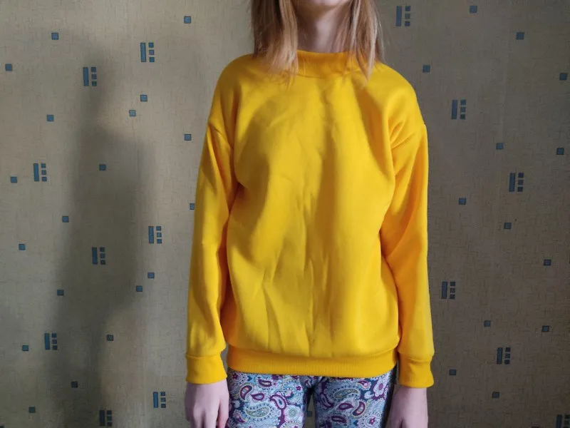 Доставка 20 дней! В первую очередь понравился цвет свитшота - солнечный, яркий! Навивает весеннее настроение! Ребёнок доволен! На 10 летнюю девочку в самый раз! Брака нет! Качество отличное! Спасибо большое! Рекомендую данного продавца!