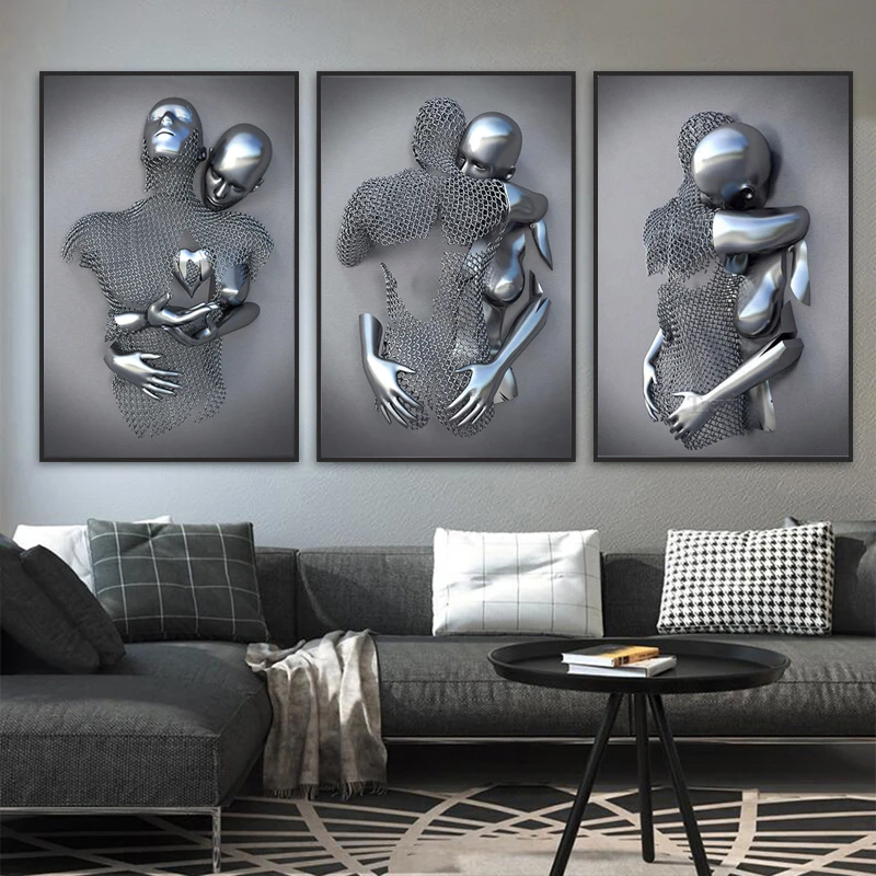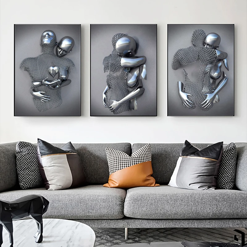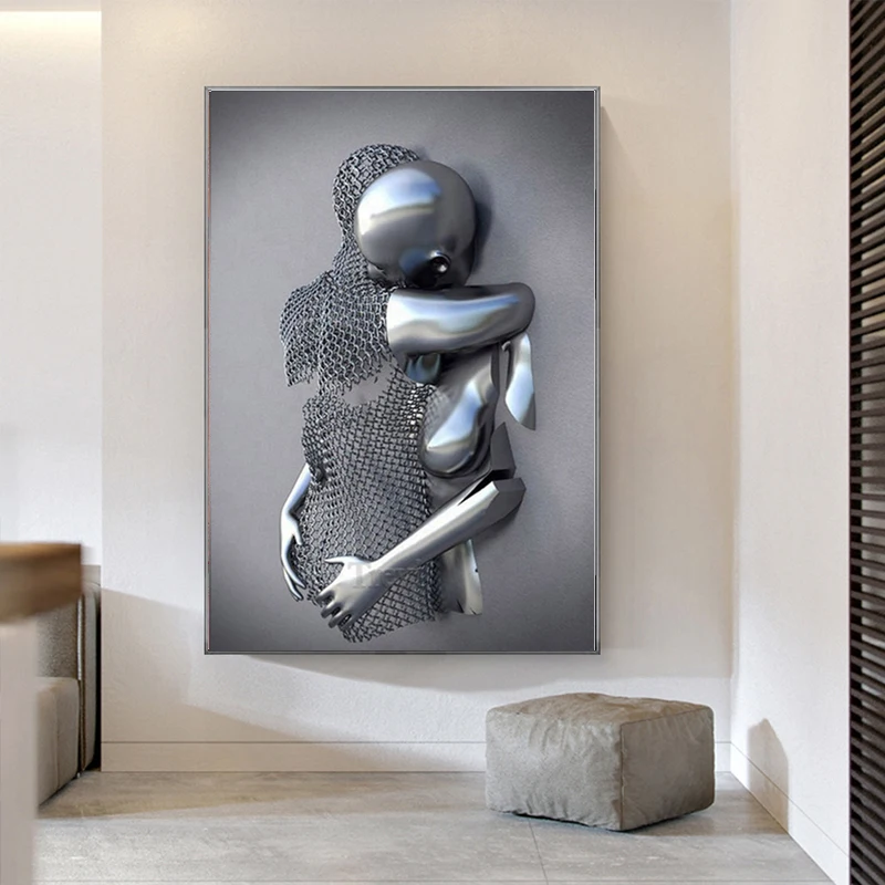 Романтические пары, металлическая статуя из сетки, Картина на холсте, серебристо-серая абстрактная художественная фигурка, живопись, современные постеры, печать для домашнего декора