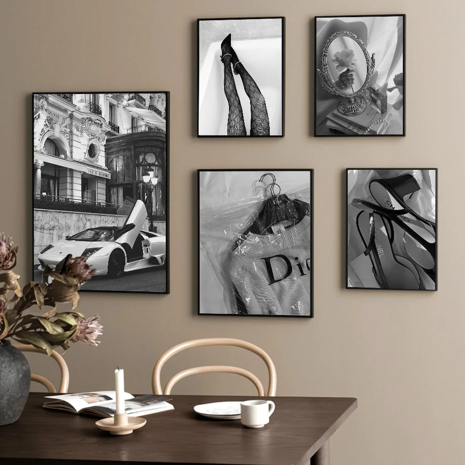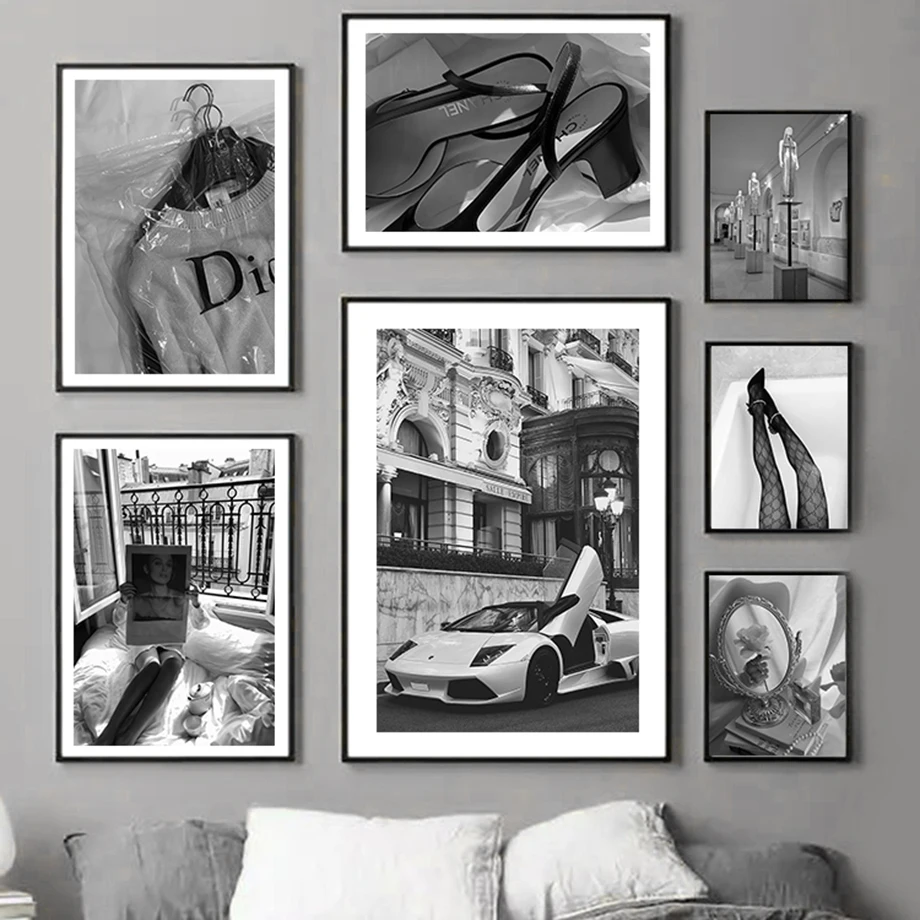 Роскошный Модный магазин, автомобиль, женщина, Черно-Белая настенная Картина на холсте, скандинавские постеры и принты, настенные картины для декора гостиной