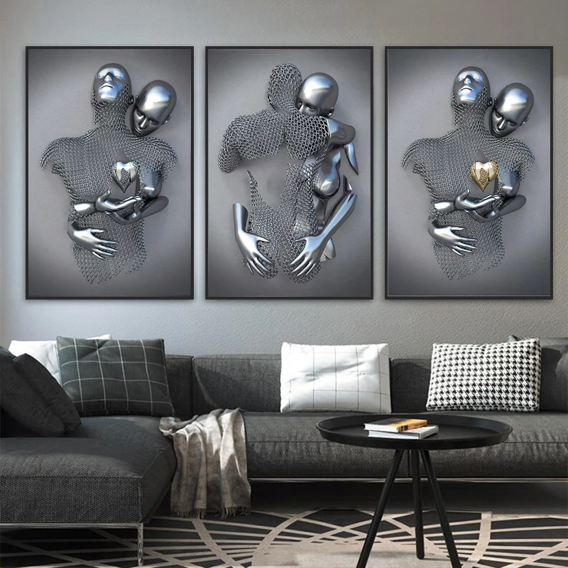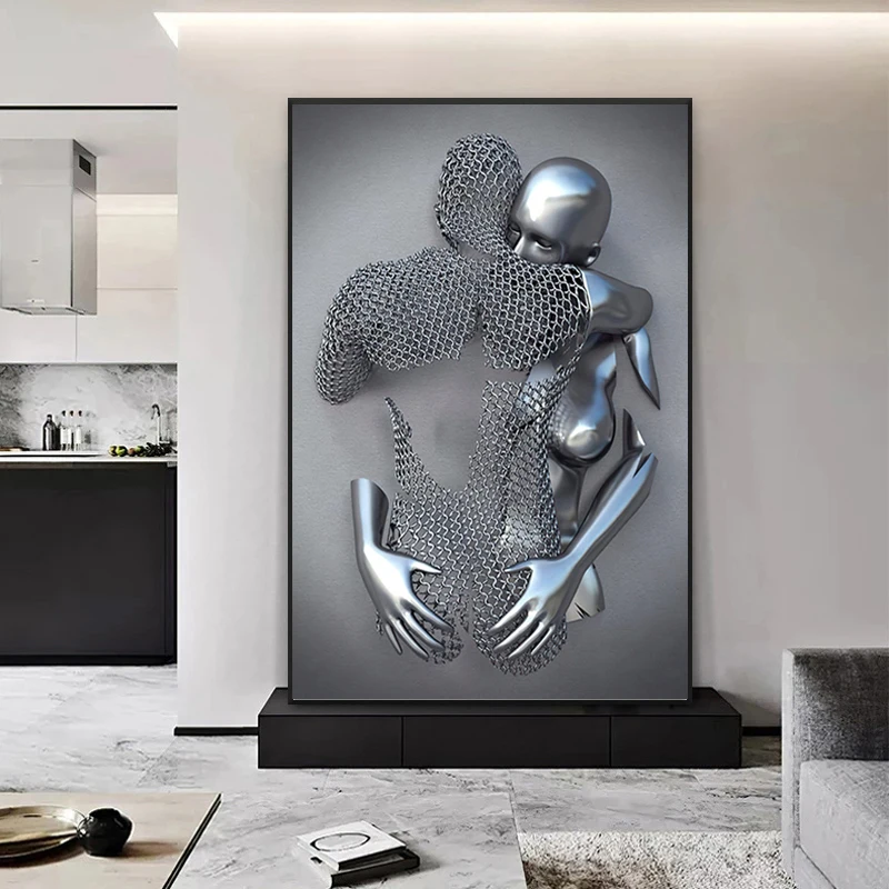Металлическая сетка статуя любовь обнимающие пары сердце плакат на холсте серебристо-серое Абстрактное Искусство Современная фигурка живопись для домашнего декора
