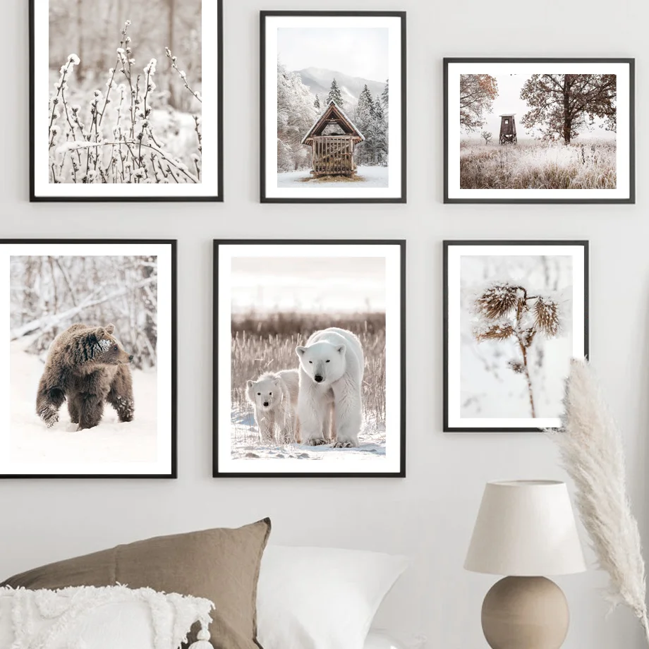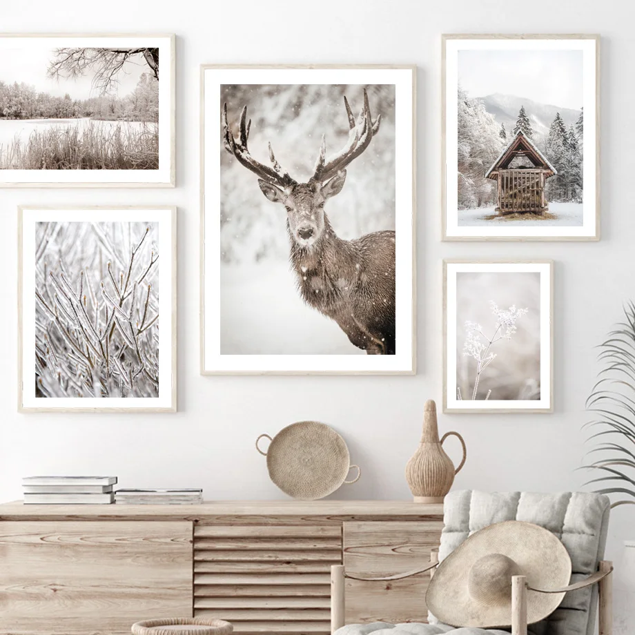Картина на холсте с изображением зимнего оленя, белого медведя, сушеных цветов, травы, озера, настенный постер в скандинавском стиле для декора гостиной