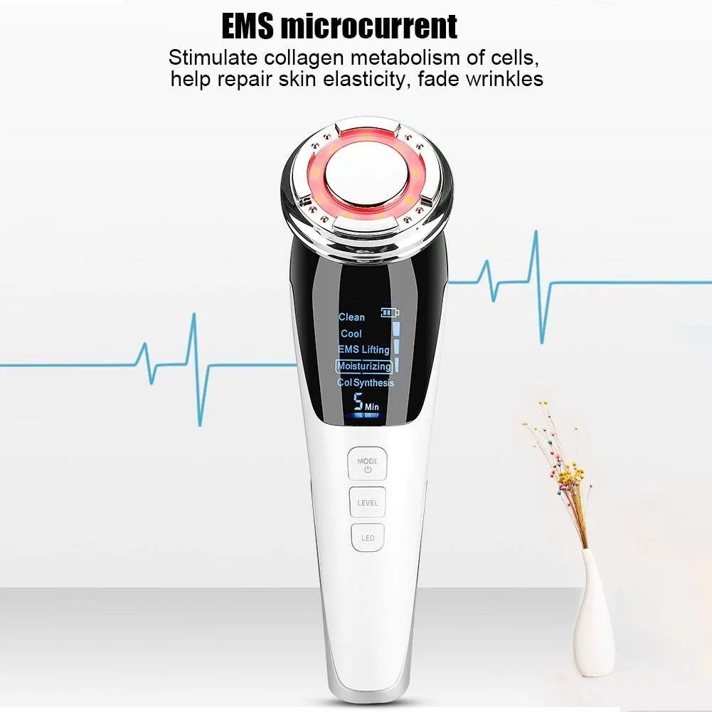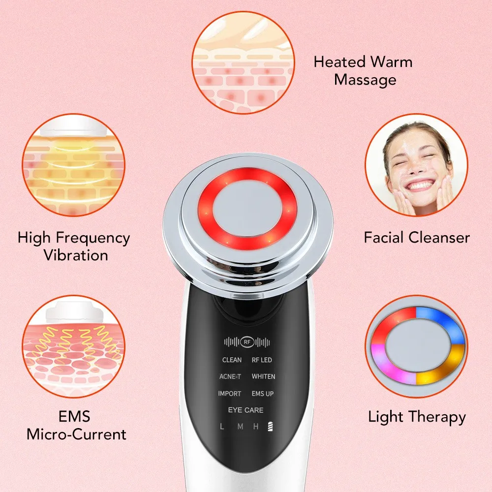 Особенности:Это устройство для красоты лица с микротоком EMS (гальванические ионы), вибрационный теплый массаж, красный, синий и оранжевый светильник, который может осуществлять глубокое очищение, лучшее омоложение и лифтинг лица.1. EMS микро-ток (гальванические ионы): Используйте принцип самого мягкого импульсного тока анода и катода притягивания, размягчения и разряда смазки и грязи.2. Вибрация принимает физический Вибрационный, электрический стимулирующий способ для повышения эластичности и улучшения клеточного метаболизма.3. Теплый массаж способствует поглощению средств по уходу за кожей, делает кожу растянутой, сохраняет кожу полной эластичностью.4, красный светильник: Красный светильник 640nm-650nm глубоко в дерму, увеличивает кровообращение для уменьшения морщин, затягивает кожу и стимулирует производство новых клеток кожи.5. Синий светильник длиной волны 415 нм оказывает быстрое противовоспалительное действие, уменьшая Живучесть кожного сала, устраняет акне bacilli для удаления акне и угрей, улучшает жирную кожу.6, оранжевый светильник: длина волны 600 Нм глубоко в кожу 1-2 мм, эффективно лечит кожу красным пятном, Снимает отеки, способствует метаболизму кутикулы, чтобы сделать кожу отбеливающей.