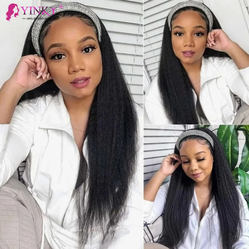 Кудрявые, прямые, половина искусственных человеческих волос, парик без клея с головной повязкой, бразильский головной убор Yaki, парики из человеческих волос для черных женщин