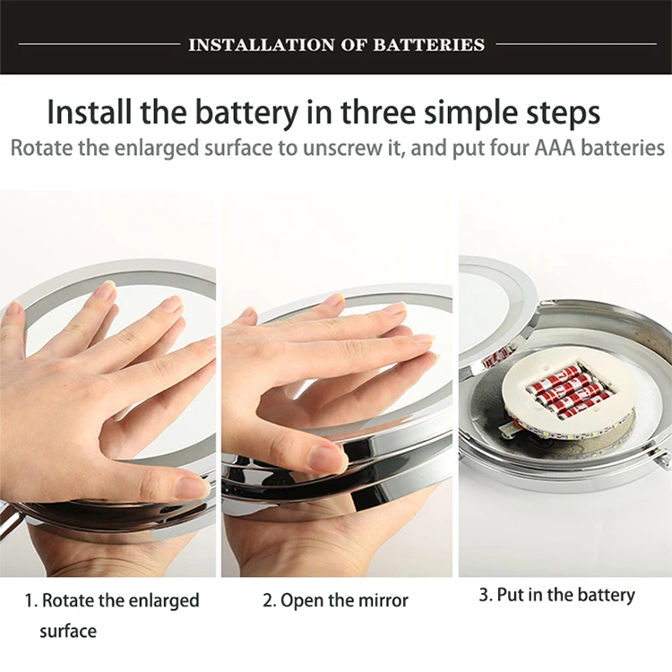 【Питание от аккумулятора и легкое Крепление-это косметическое зеркало с рукояткой питается от 4 батареек, может использоваться в беспроводном режиме. Примечание: батарея в комплект не входит. Предлагается аккумуляторная батарея.