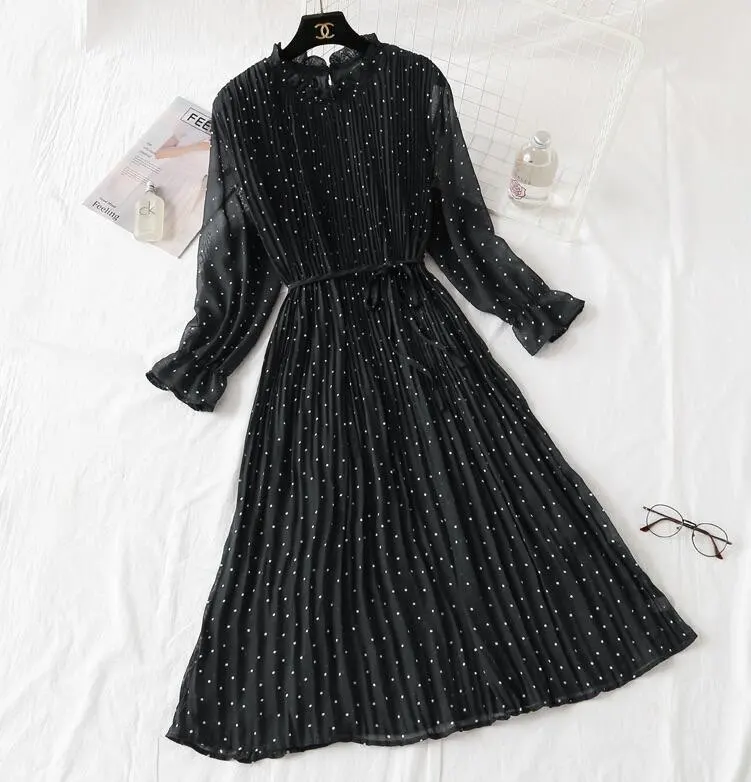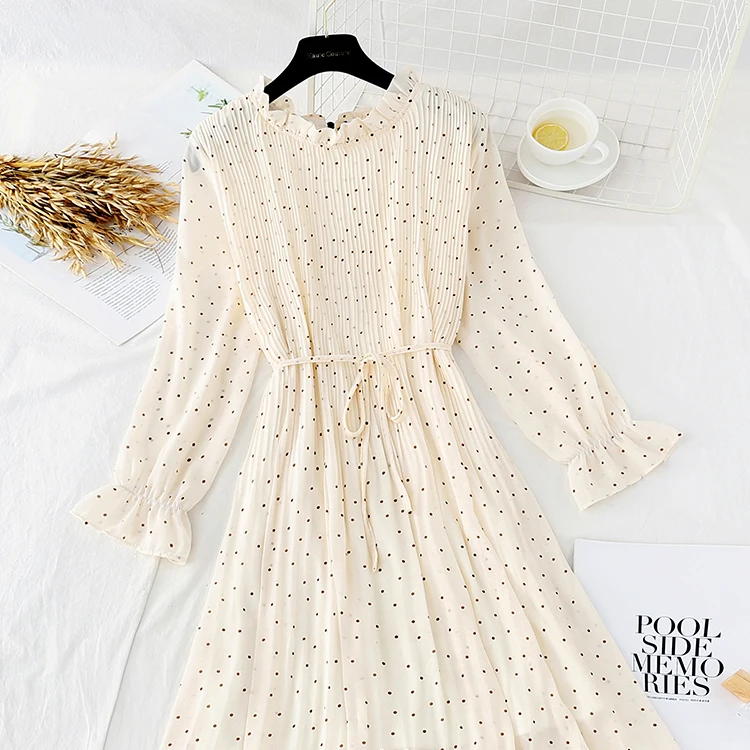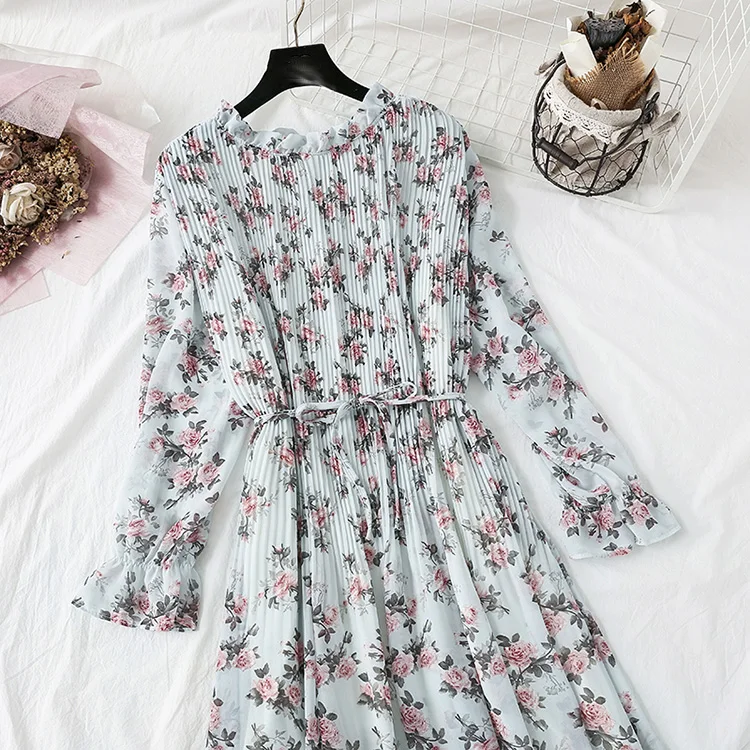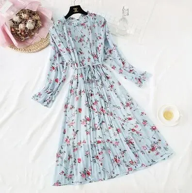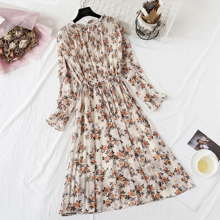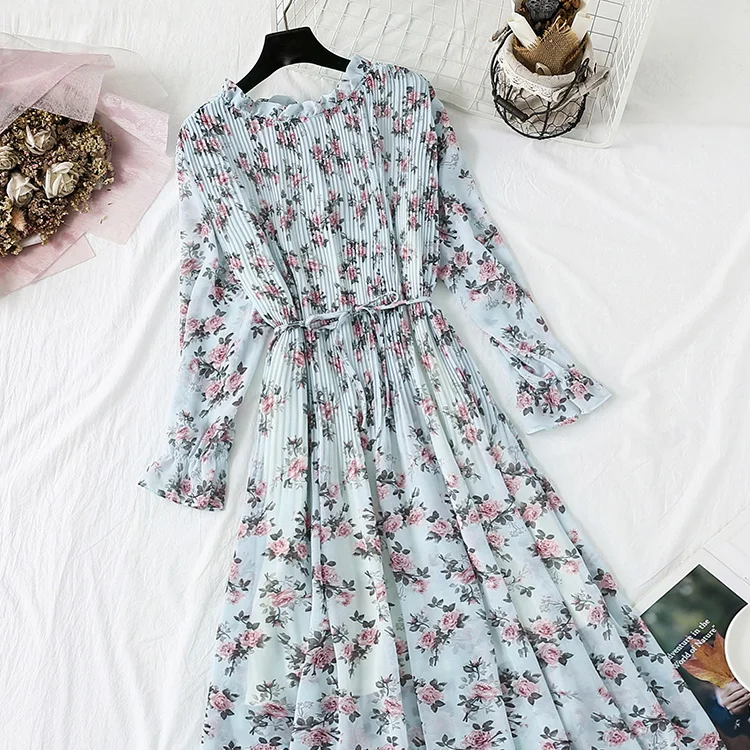 Женское длинное платье, винтажное шифоновое плиссированное платье с цветочным принтом и длинным рукавом, свободные платья в строгом стиле, весна-осень 2022