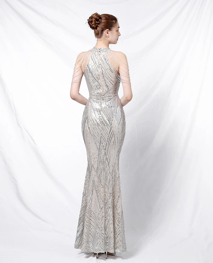 Женское вечернее платье, с воротником-хомутом и блестками, серебрис...