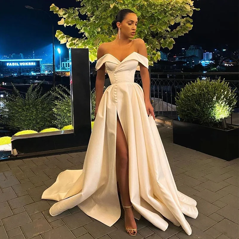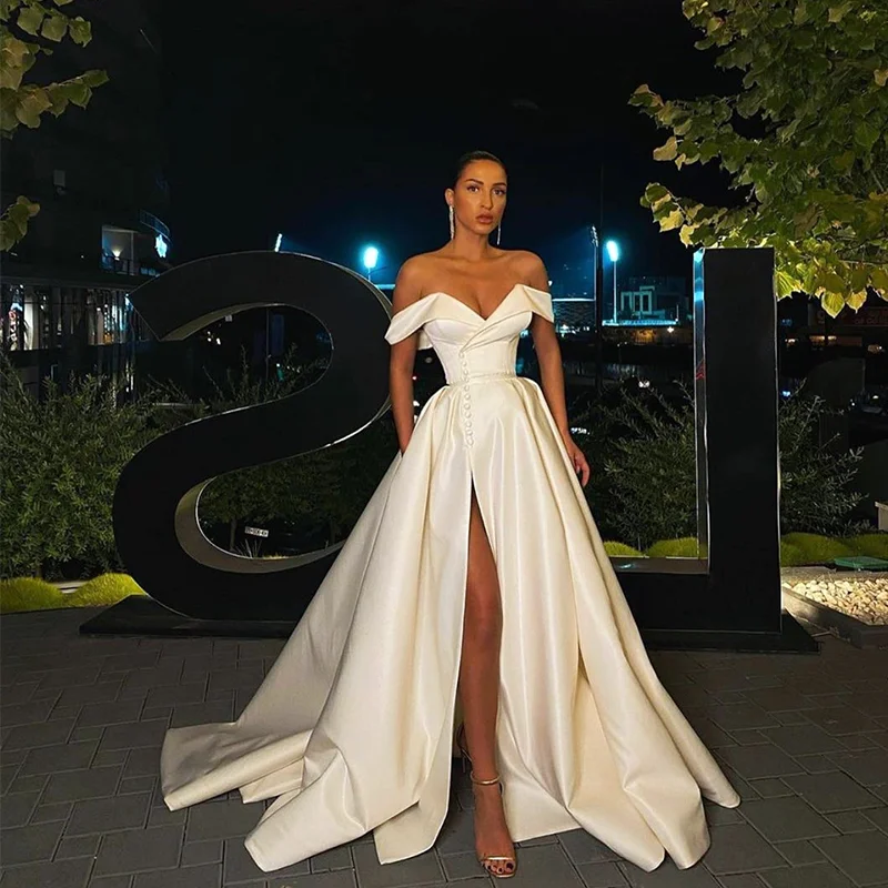 Funyue очаровательные Выпускные платья с V-образным вырезом 2022 сексуальные с открытыми плечами с высоким разрезом трапециевидные атласные длинные вечерние платья для торжества