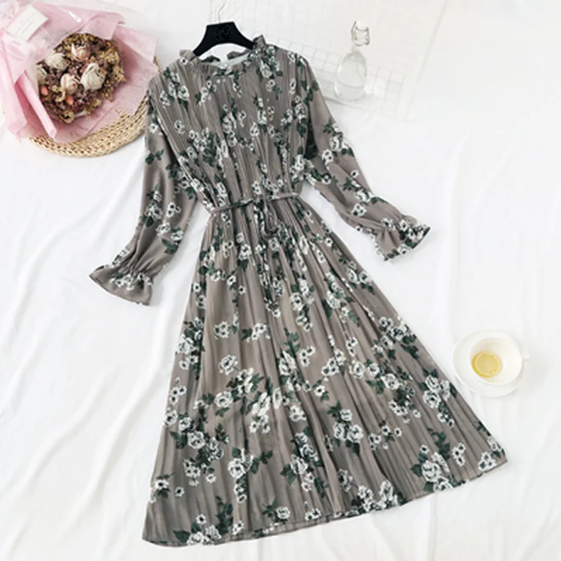 Шифоновое платье с цветочным принтом, женское весеннее свободное офисное плиссированное платье миди с расклешенными рукавами и оборками, повседневное женское платье 2022