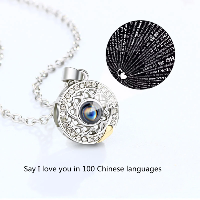 Ожерелье с проекцией Я люблю тебя на 100 языках, солнце и луна, пам...