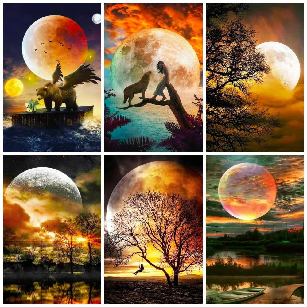 Алмазная мозаика HUACAN с полным заполнением, живопись с Луной, вышивка деревом, пейзаж, креативные хобби, украшение для спальни
