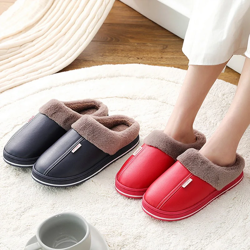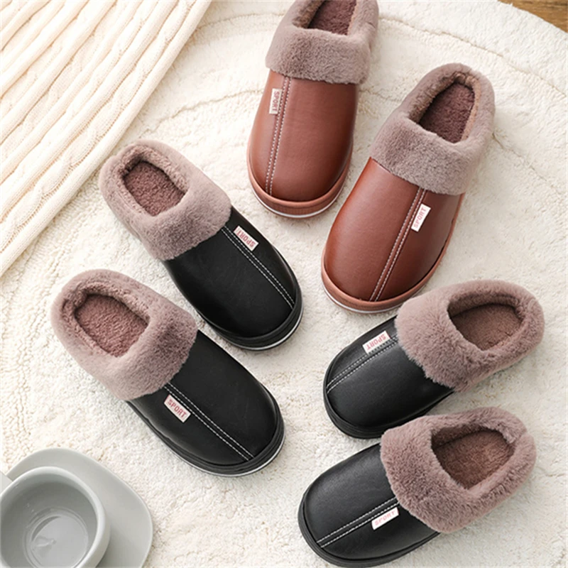 Водонепроницаемые тапочки из ПУ кожи для мужчин и женщин, зимние плюшевые теплые домашние тапочки на плоской подошве, женская мягкая удобная обувь, шитые домашние тапочки
