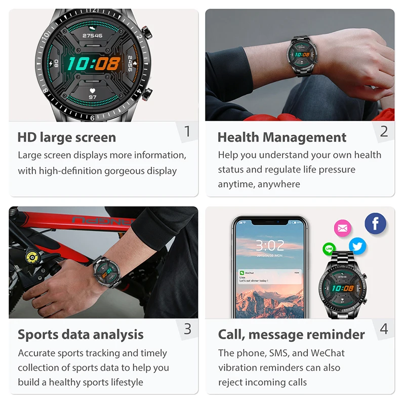 Параметры продукта:Экран: 1,3-дюймовый IPS высокой четкости full-fit круглый ЭкранСенсорная панель: Полный сенсорный экранАккумулятор: 200 мАчПриложение: WearFit 2,0Метод зарядки: Магнитная ЗарядкаВодонепроницаемость: IP67Аппаратный параметр:Bluetooth:BT4.0Звонки по Bluetooth: BT3.0Системы версия: Android выше 5,4IOS выше 8,0Функция программного обеспечения:Прием/отклонение телефонных звонков/телефонных звонков с циферблатом, мониторинг сердечного ритма, мониторинг кровяного/кровяного давления, мониторинг сна, напоминание о сидячем положении, шагомер/потребление калорий/запись отслеживания/время упражнений, напоминание о звонках и дисплей, сообщение толкается и отображается, камера дистанционного управления, автоматическое измерение сердечного ритма, мульти-спорт, измерение, напоминание о часах, напоминание о тревоге, 5 видов циферблатов по умолчанию. Индивидуальные Циферблаты часов в приложении являются необязательными.Язык:Браслет поддерживает языки: английский, китайский, испанский, французский, русский, португальский, польскийПриложение (WearFit 2,0) Поддержка языка:Английский, японский, корейский, немецкий, испанский, французский, итальянский, русский, португальский, арабский, китайский,Посылка включает в себя:Хост, зарядное устройство, ремешок на запястье, руководство, коробка